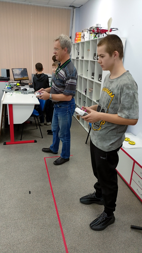 На прошедшем занятии кружка ребята тренировались летать в реальных условиях и на симуляторе полетов. Также, опробовали синхронный полет на двух квадрокоптерах.