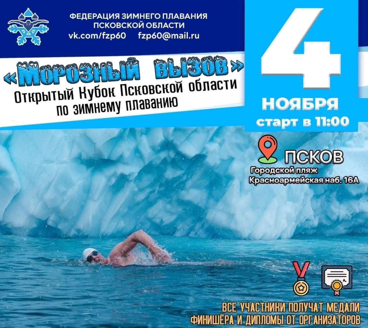 Федерация зимнего плавания Псковской области 4 ноября провела Открытый Кубок Псковской области по зимнему плаванию «Морозный вызов».