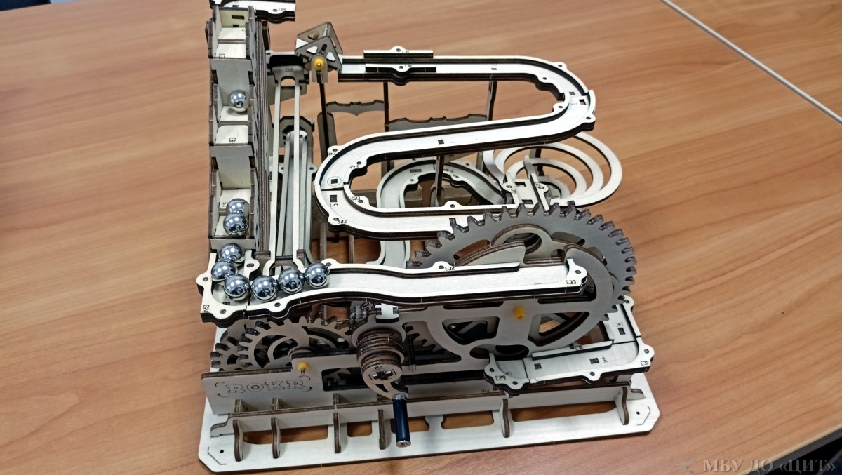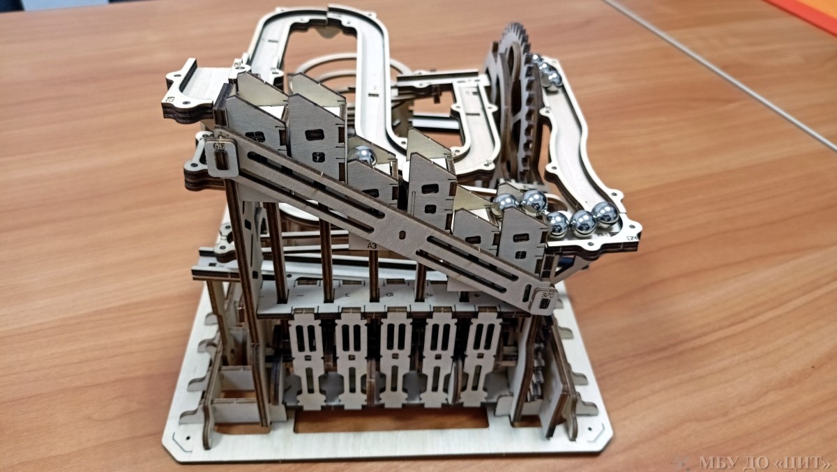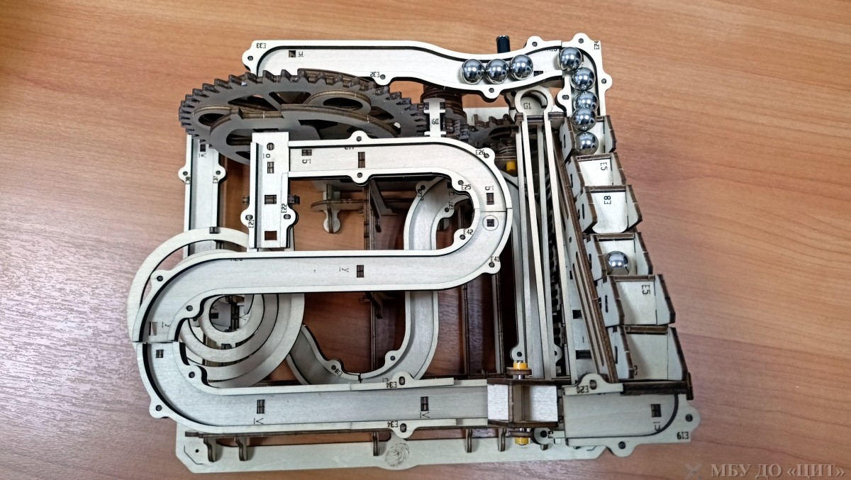 Первым свою модель показывает Ростковский Артем (I метсо в категории «Tinkercad»). Модель работает, все шестеренки встали на свои места, шарики поднимаются и скатываются в двух направлениях по системам желобов.