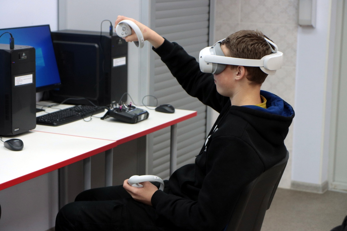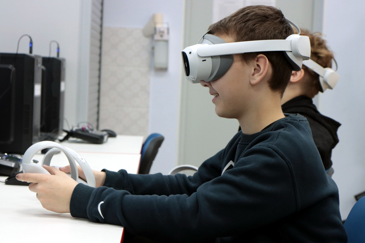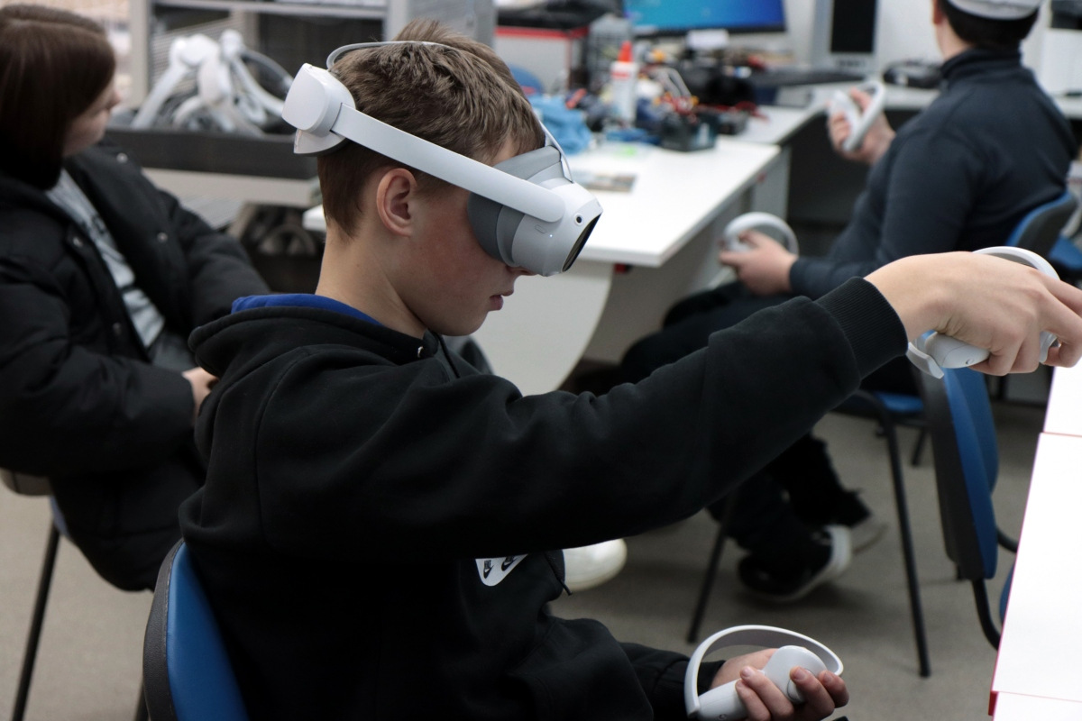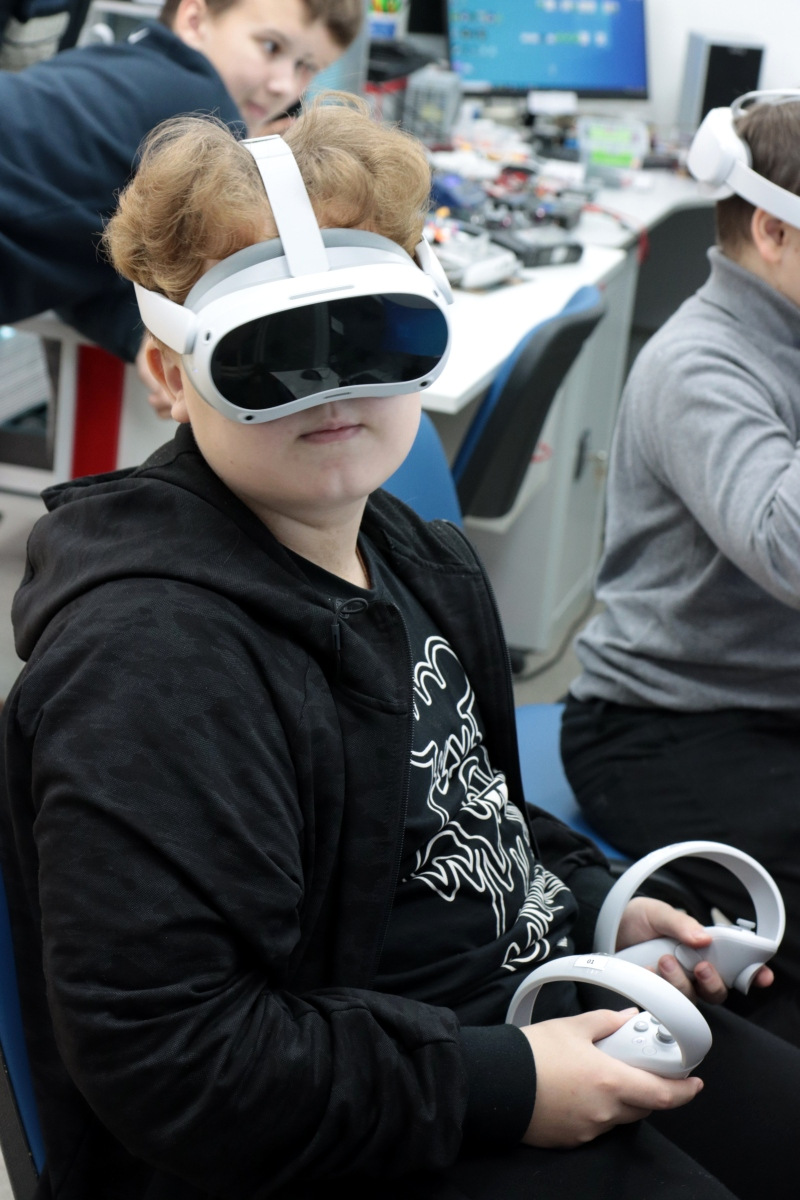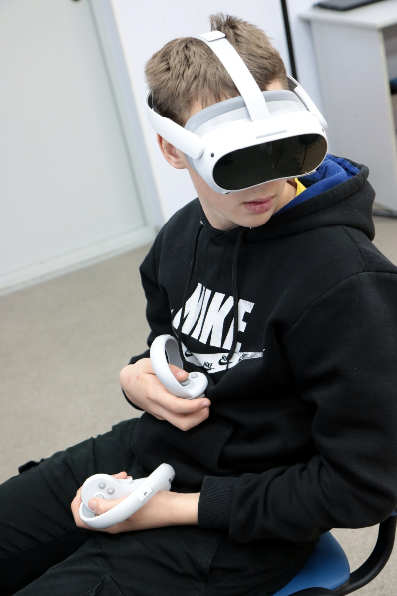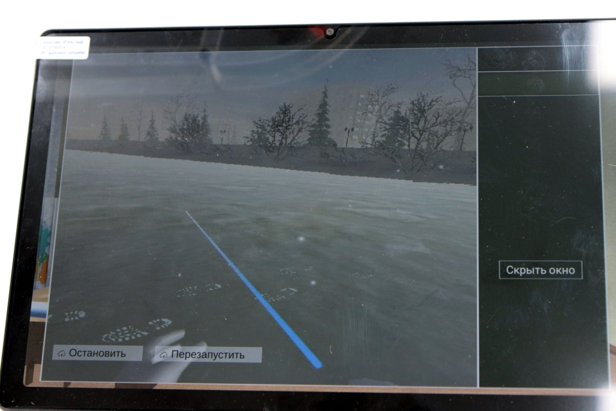 Вторым приятным сюрпризом были очки виртуальной реальности, которые постепенно настраиваются и готовятся к будущим занятиям. Сегодня можно было поучаствовать в сценариях по ОБЖ. В одном случае надо было помочь человеку, провалившемуся под лед. Второй сценарий был посвящен поведению на железных дорогах.