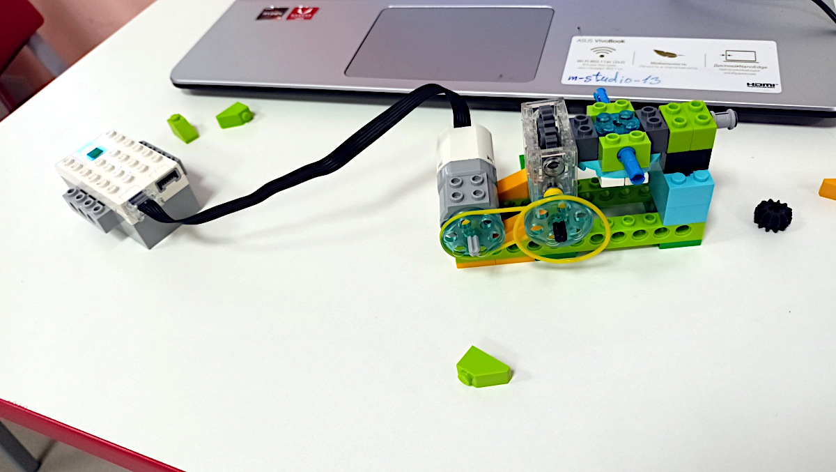В один из последних дней на кружке робототехники начинающие конструкторы выполняли задание со сдвоенными блоками, основанное на изучении принципа ременной передачи. А именно, должна была получиться болгарка. Получилась. А дальше «Остапов понесло».