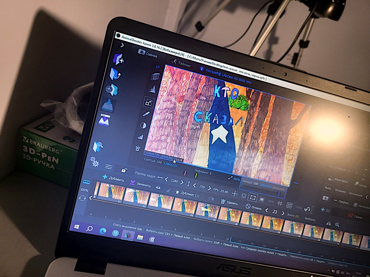 Мультфильм создаётся покадрово, с использованием техники stopmotion – ребята перемещают персонажей, делаю кадр, затем перемещают персонажа снова и делают следующий кадр.