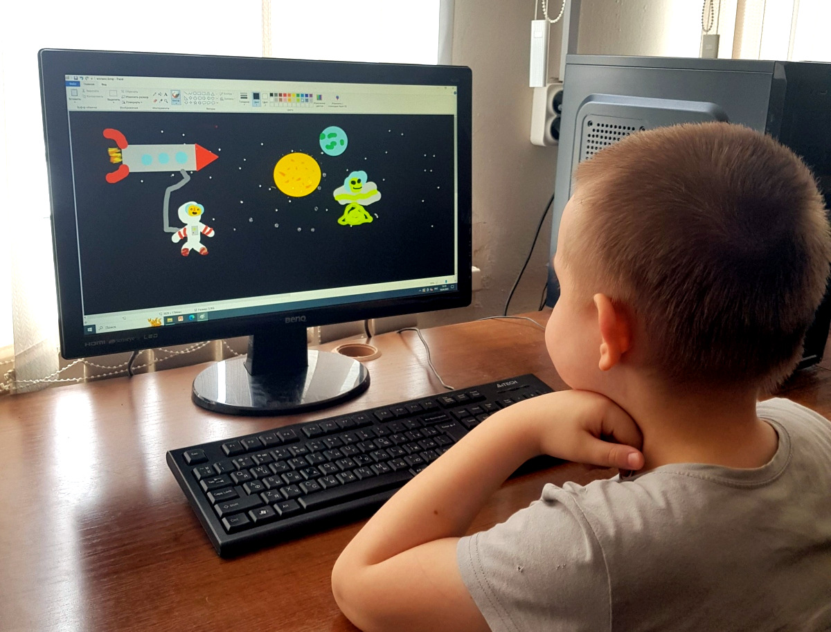И в заключительной части занятия, ученикам выдалась возможность пофантазировать на тему космоса и создать в графическом редакторе праздничные открытки.
