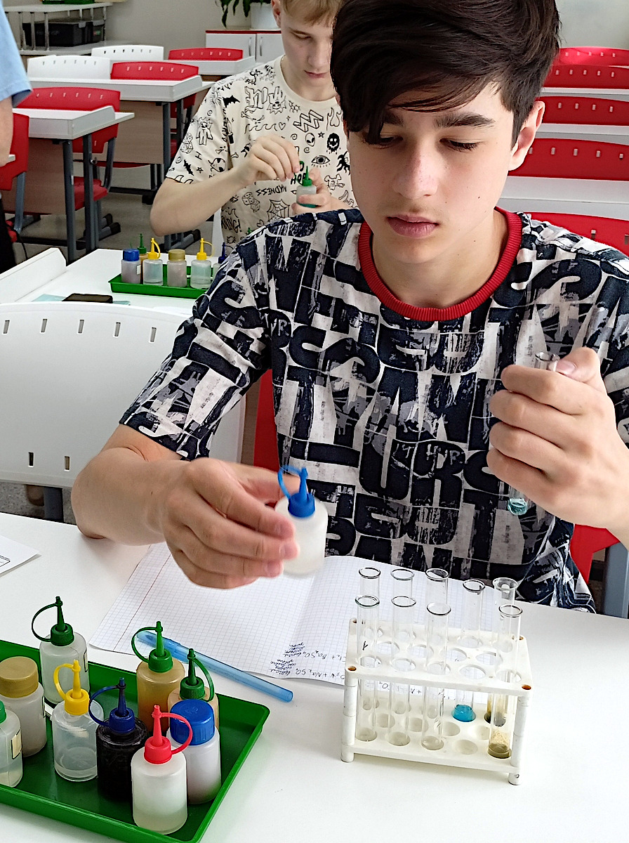 Химия. Самый таинственный предмет. И с первых занятий Ольга Анатольевна Агафонова учит ребят не бояться вещества и смело проводить опыты. Химия не только сложный предмет — это и один из самых зрелищных предметов. Когда наблюдаешь, как ребята смешивают в пробирке вещества, очень хочется увидеть результат. Все получилось. Ничего не взорвалось. Хотя, руки подрагивали.