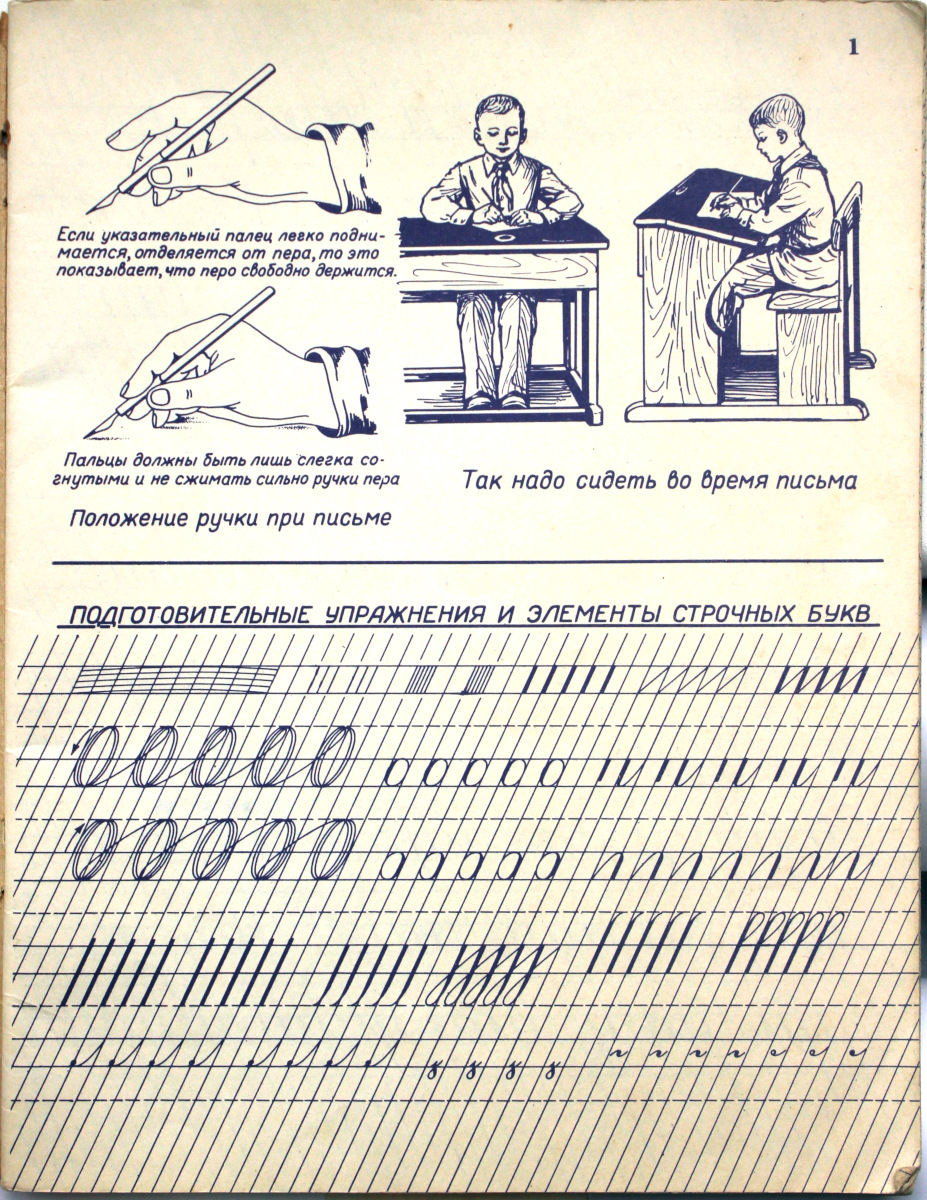 У нас появился уникальный экспонат — настоящие (не перевыпущенные) прописи А.И. Воскресенской и Н.И. Ткаченко 1956 года. По таким прописям советские школьники учились красивому, разборчивому и аккуратному почерку на уроках чистописания. С первого по третий класс ученики старательно выводили в прописях буквы, цифры, слоги, предложения и небольшие тексты, доводя почерк до совершенства.