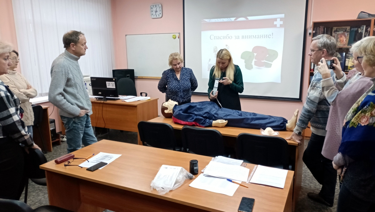 На очном занятии была возможность задать вопросы и попрактиковать оказание первой помощи, что вызвало большой интерес со стороны слушателей.