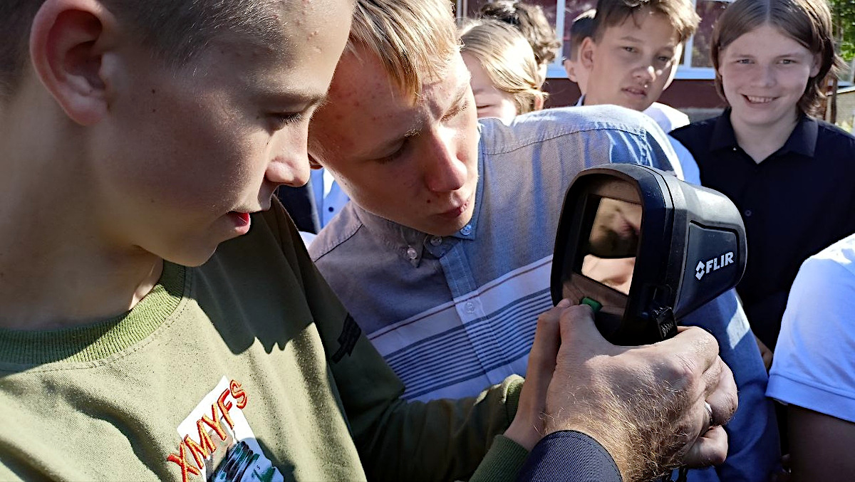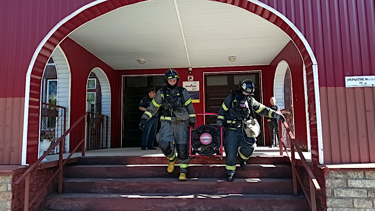 К школе подъехали 3 пожарные машины, развернули пожарные рукава и выдвинули лестницу к окну кабинета химии, где был «заблокирован пожаром» сотрудник школы. Под аплодисменты «зрителей» сотрудника благополучно спасли, а пожар потушили, после чего ветродуем проветрили школу.