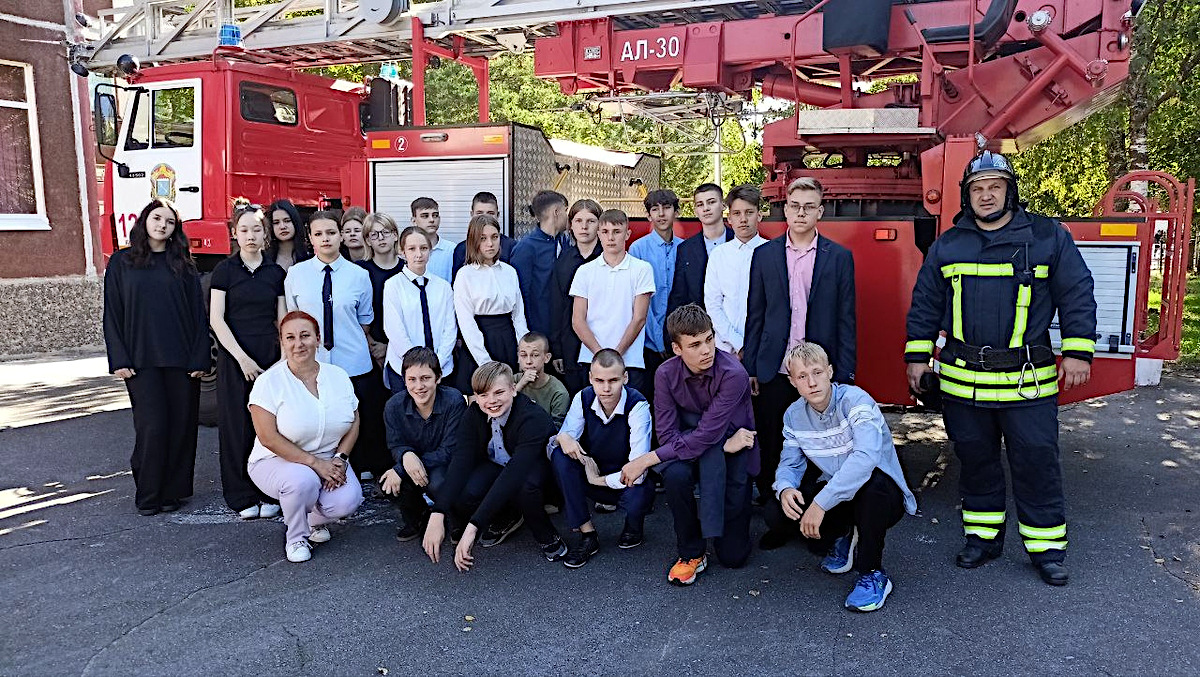 По окончании тренировки классы фотографировались рядом с техникой и знакомились с оборудованием пожарной службы.