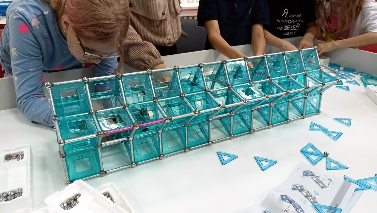 Работа шла в командах, где каждый собирал свои фрагменты, а потом надо было всем объединить свои усилия и построить что-то большое. В итоге получались очень интересные и впечатляющие строения.
