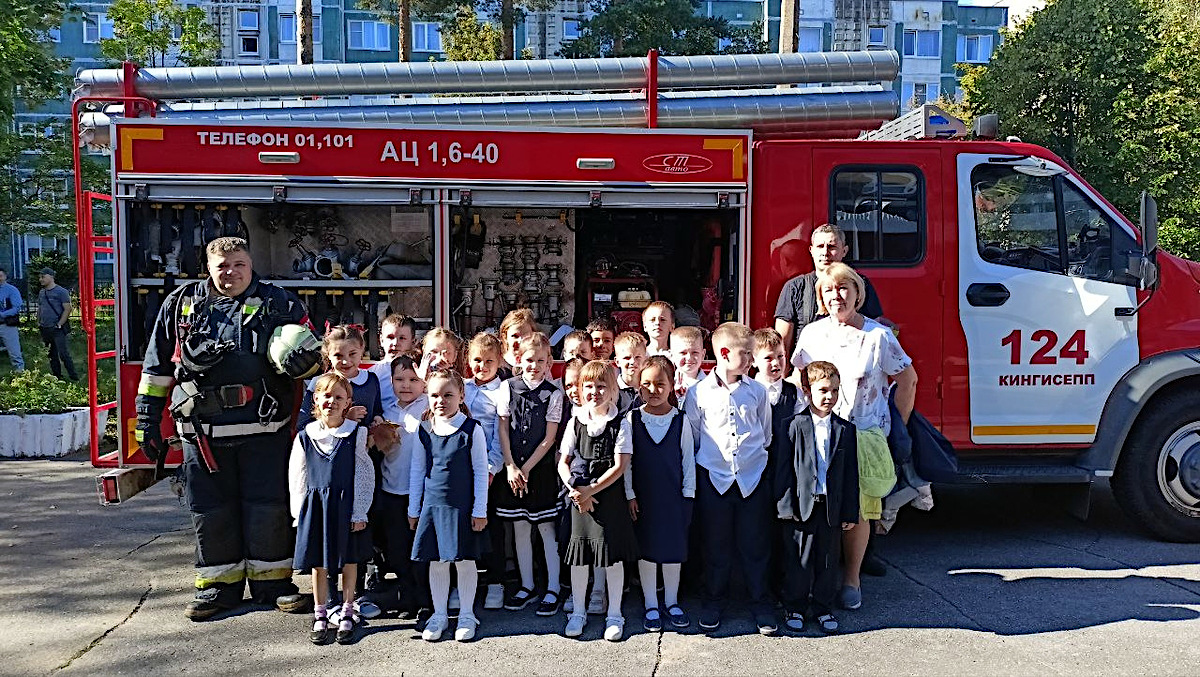 По окончании тренировки классы фотографировались рядом с техникой и знакомились с оборудованием пожарной службы.