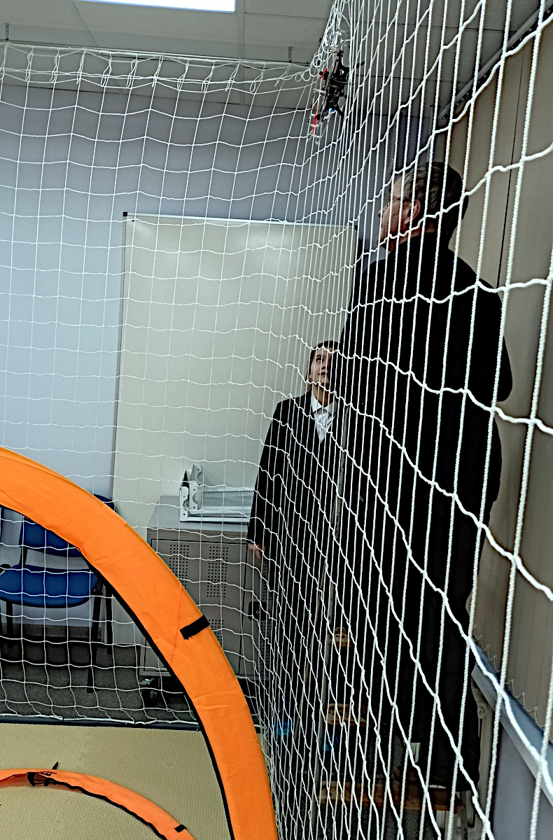 Бывают курьезы, и не только у новичков. Коптер выскакивает за пределы полетной зоны, пробираясь между створок сети, спотыкается о ворота, когда уже кажется, что они пройдены, оператор теряет ориентацию. Из новых ляпов — коптер запутался в сети под самым потолком.