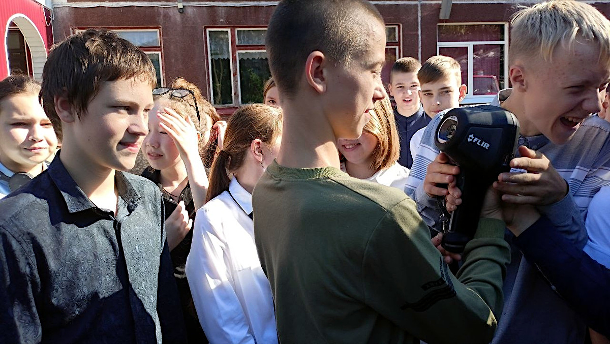 К школе подъехали 3 пожарные машины, развернули пожарные рукава и выдвинули лестницу к окну кабинета химии, где был «заблокирован пожаром» сотрудник школы. Под аплодисменты «зрителей» сотрудника благополучно спасли, а пожар потушили, после чего ветродуем проветрили школу.