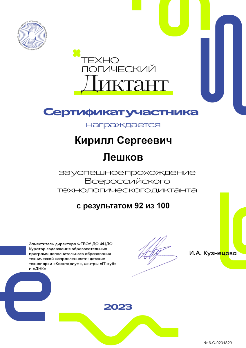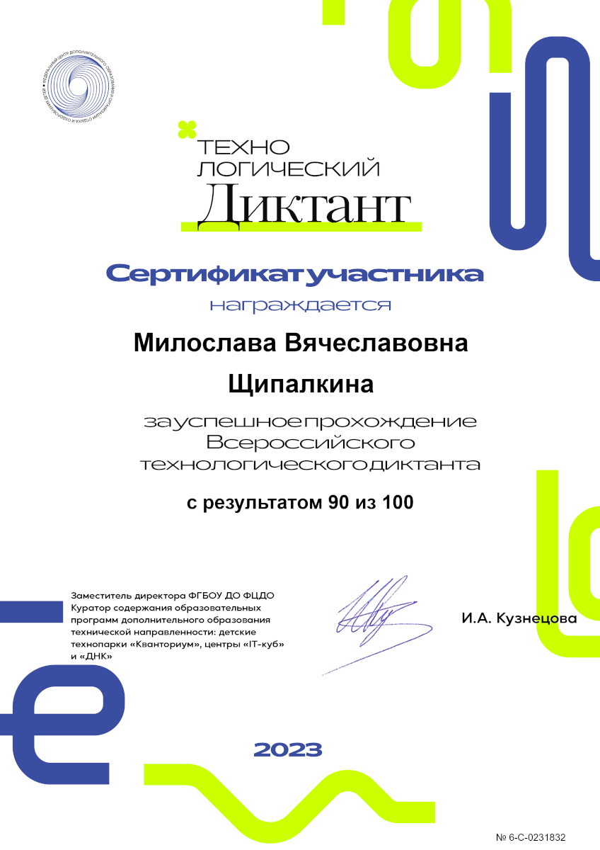 Участники диктанта получают Сертификаты. Уже есть очень достойные результаты. Так, Щипалкина Милослава получила 90 баллов из 100, а Лешков Кирилл заработал 92 балла из 100!