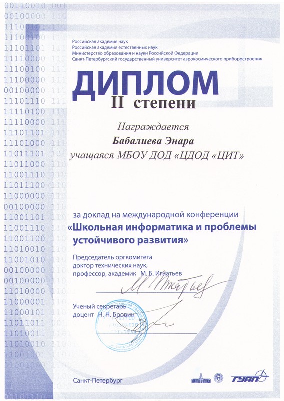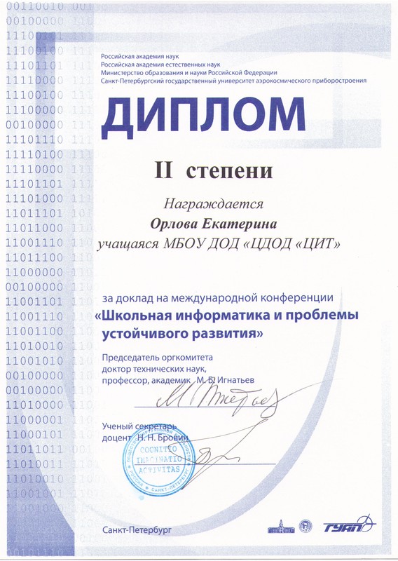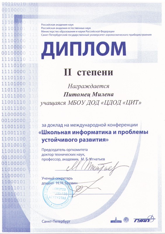 Воспитанники МБОУ ДОД «ЦДОД «ЦИТ» награждены дипломами II степени за доклады на 33 Международной конференции «Школьная информатика и проблемы устойчивого развития»: