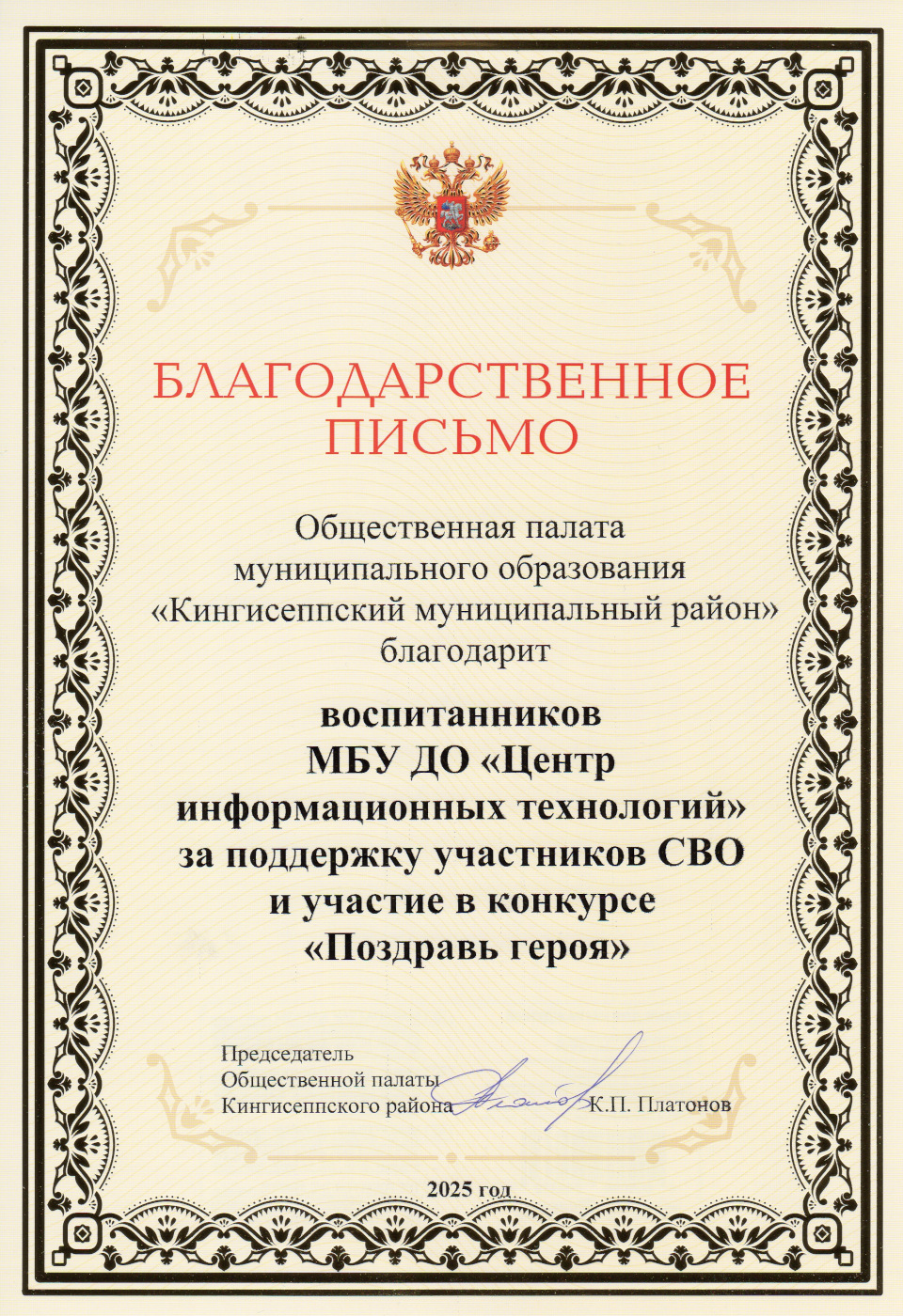 Коллективу ЦИТ вручено Благодарственное письмо Общественной палаты МО «Кингисеппский муниципальный район» за поддержку участников СВО и участие в конкурсе «Поздравь героя».