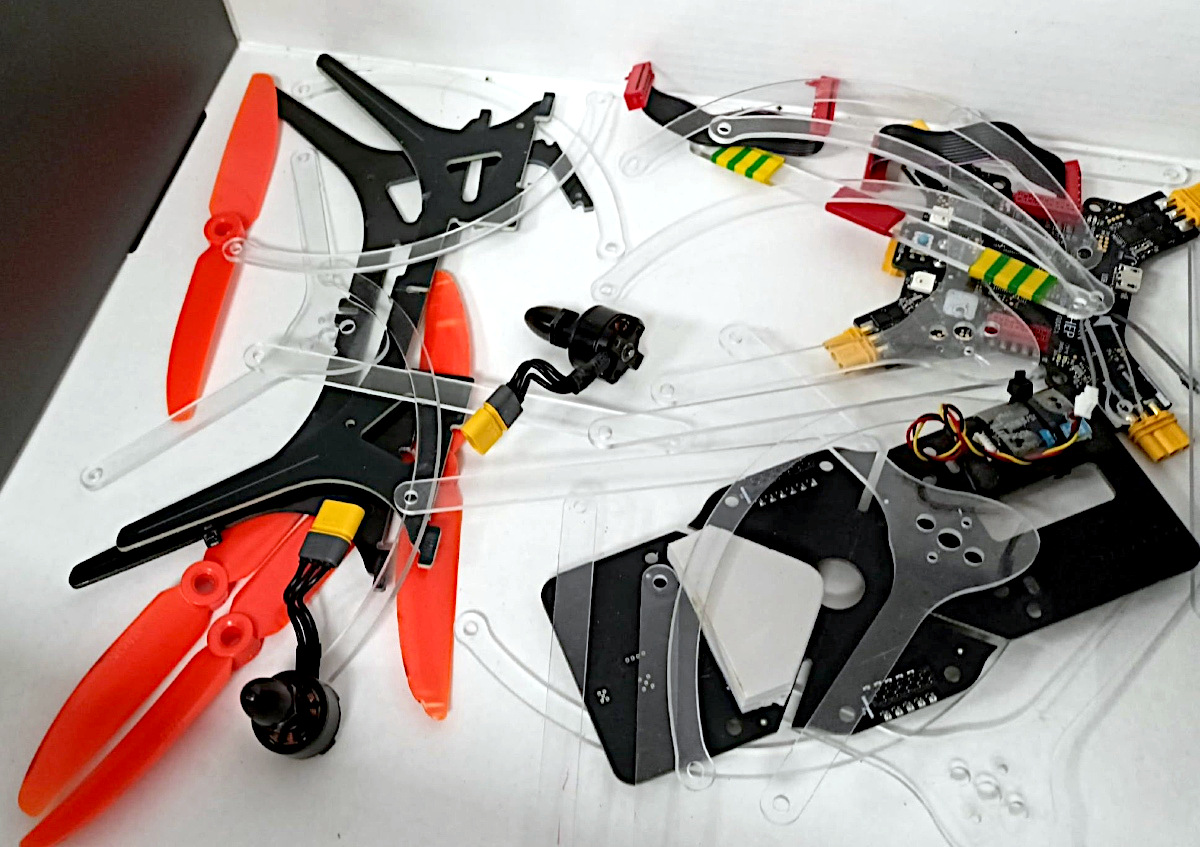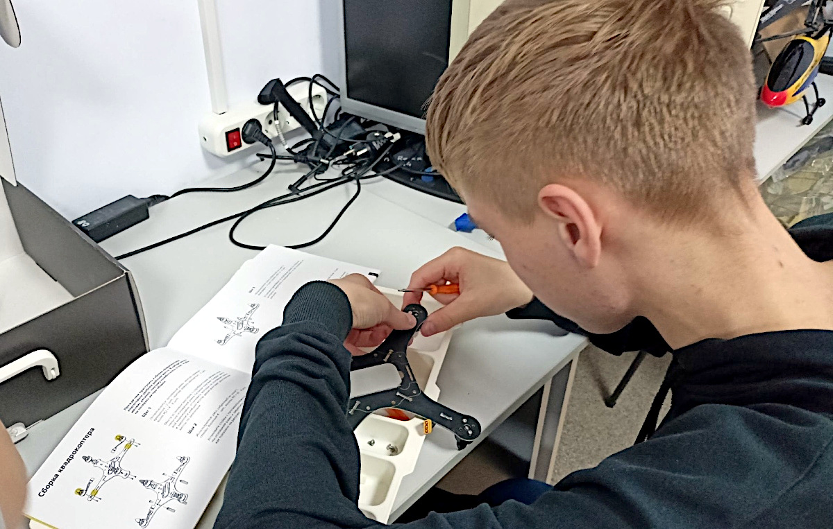 На сборку коптера уходит примерно 2 занятия, если правильно следуешь рекомендациям инструкции. Заодно разбираемся, какие бывают винты (размеры, шаг, маркировка), как называются и за что отвечают составляющие БПЛА устройства. Педагог вмешивается с подсказками только по запросу ученика. Вся ценность этой работы — самостоятельно разобраться в описании и собрать квадрокоптер, который будет способен летать.