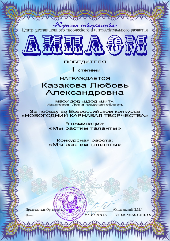 Поздравляем педагога дополнительного образования детей Казакову Любовь Александровну с победой во Всероссийском конкурсе «Новогодний карнавал творчества» и желаем дальнейших творческих успехов и профессионального роста.
