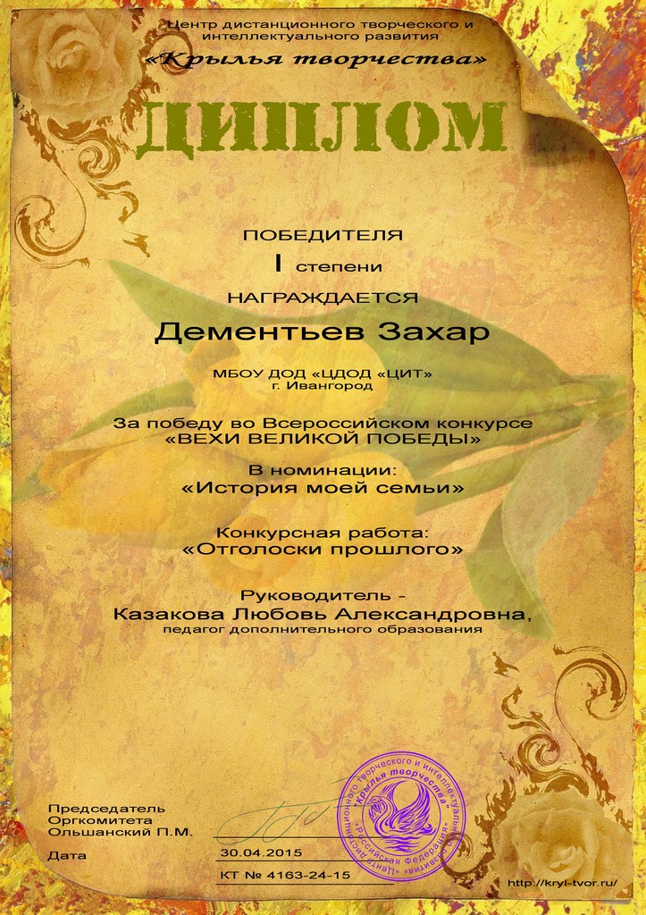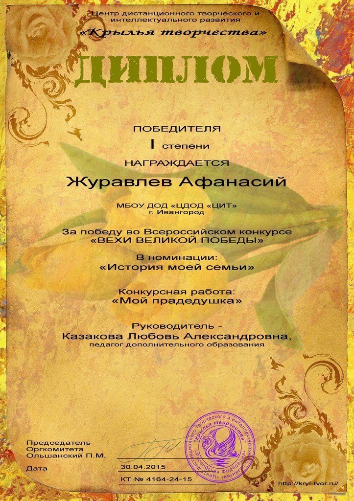 Поздравляем победителей Всероссийского конкурса «Вехи Великой Победы» (Крылья творчества) в номинации «История моей семьи»!