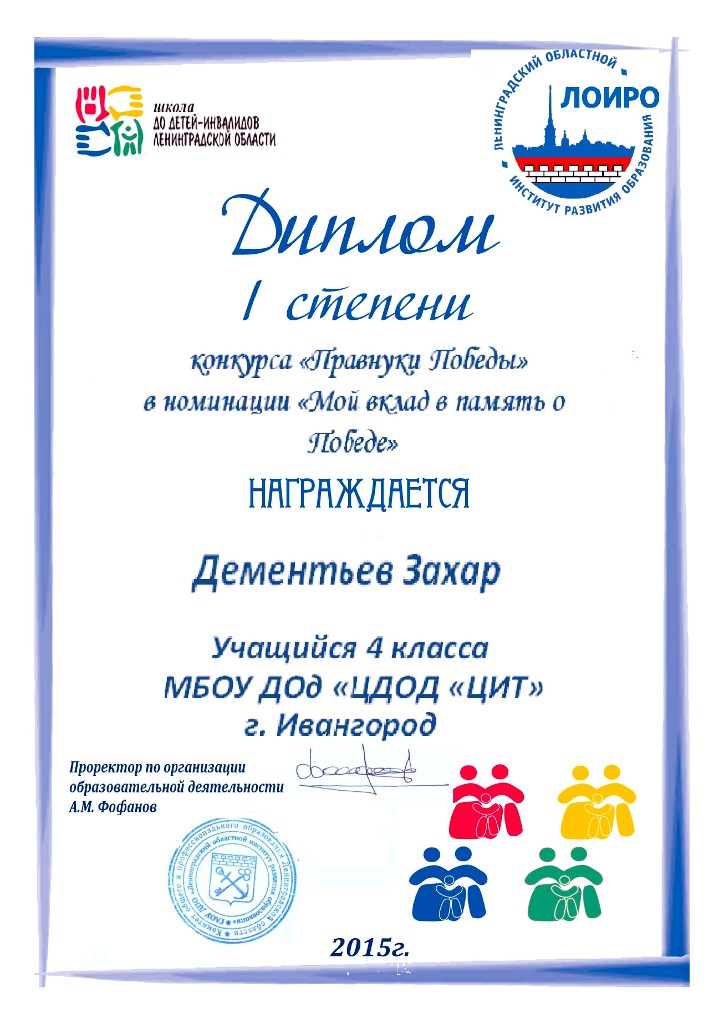 Поздравляем воспитанника Центра информационных технологий Дементьева Захара с победой (Диплом I степени) в конкурсе «Правнуки Победы» в номинации «Мой вклад в память о Победе»!