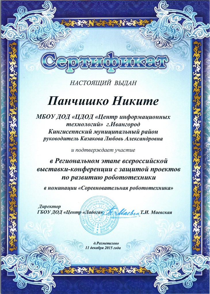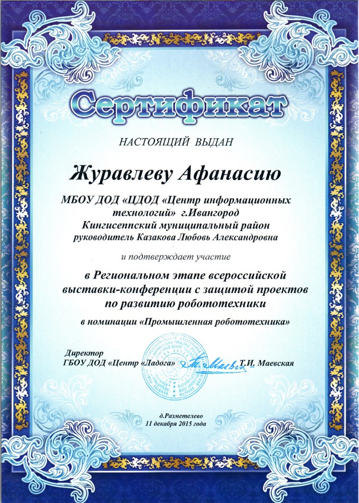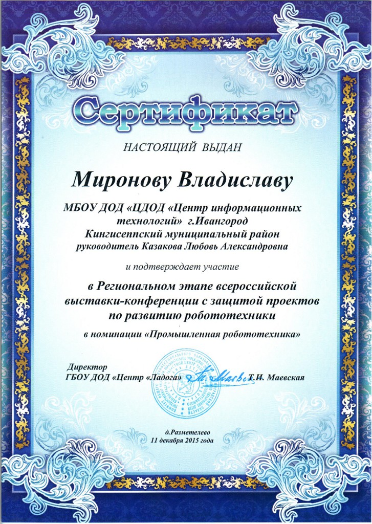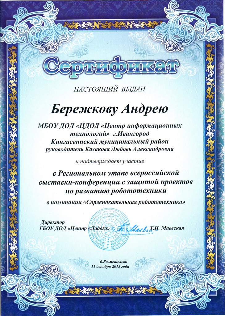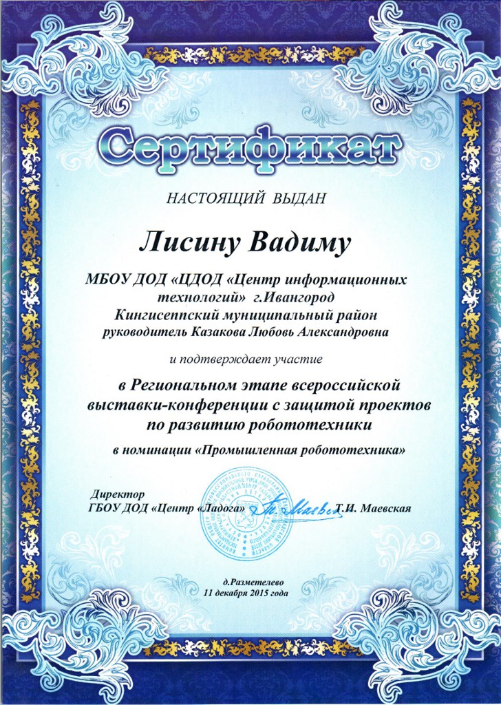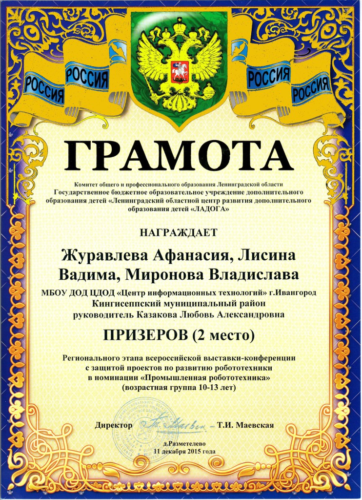 От МБОУ ДОД «ЦДОД «Центр Информационных Технологий» Кингисеппского района было представлено 5 проектов. Итогом защиты стало 2 место проекта «Робот — санитар v.2» (Журавлев Афанасий, Лисин Вадим и Миронов Владислав) в номинации «Промышленная робототехника».