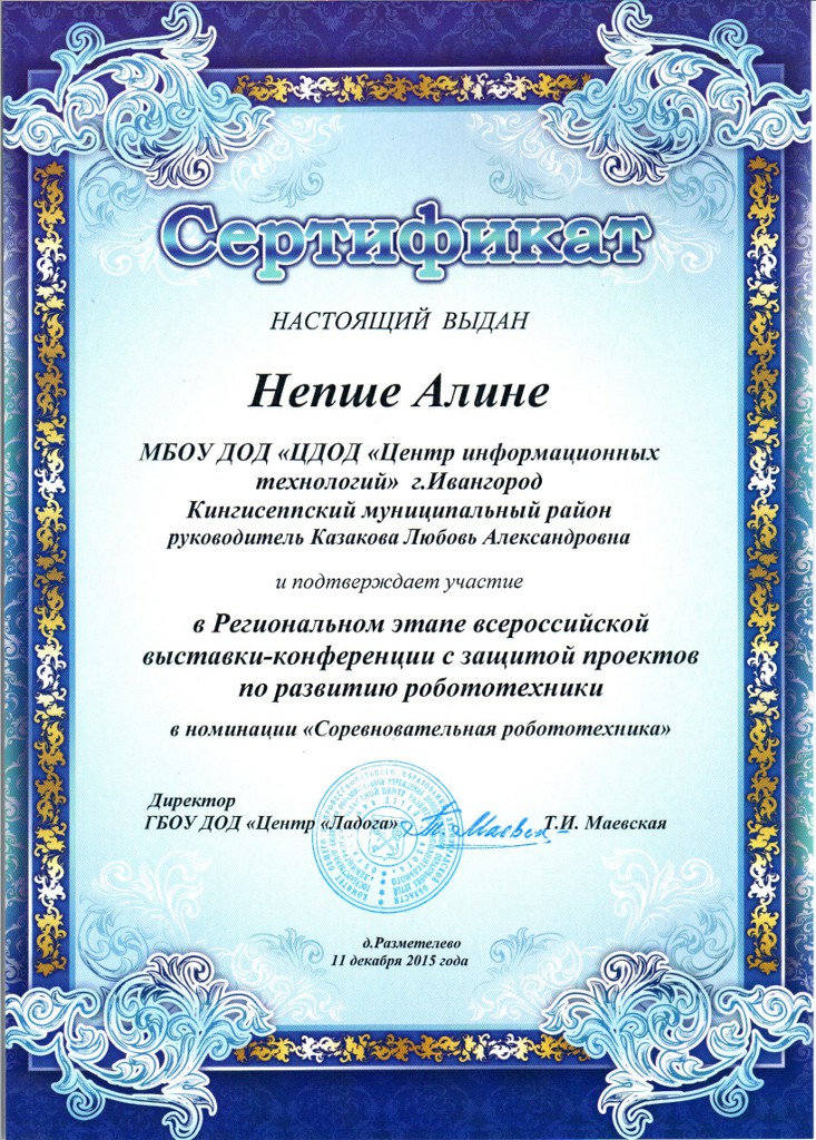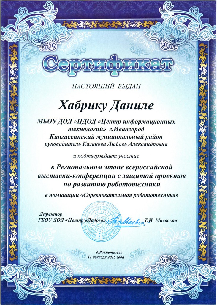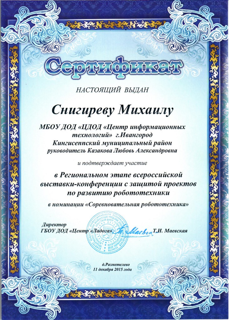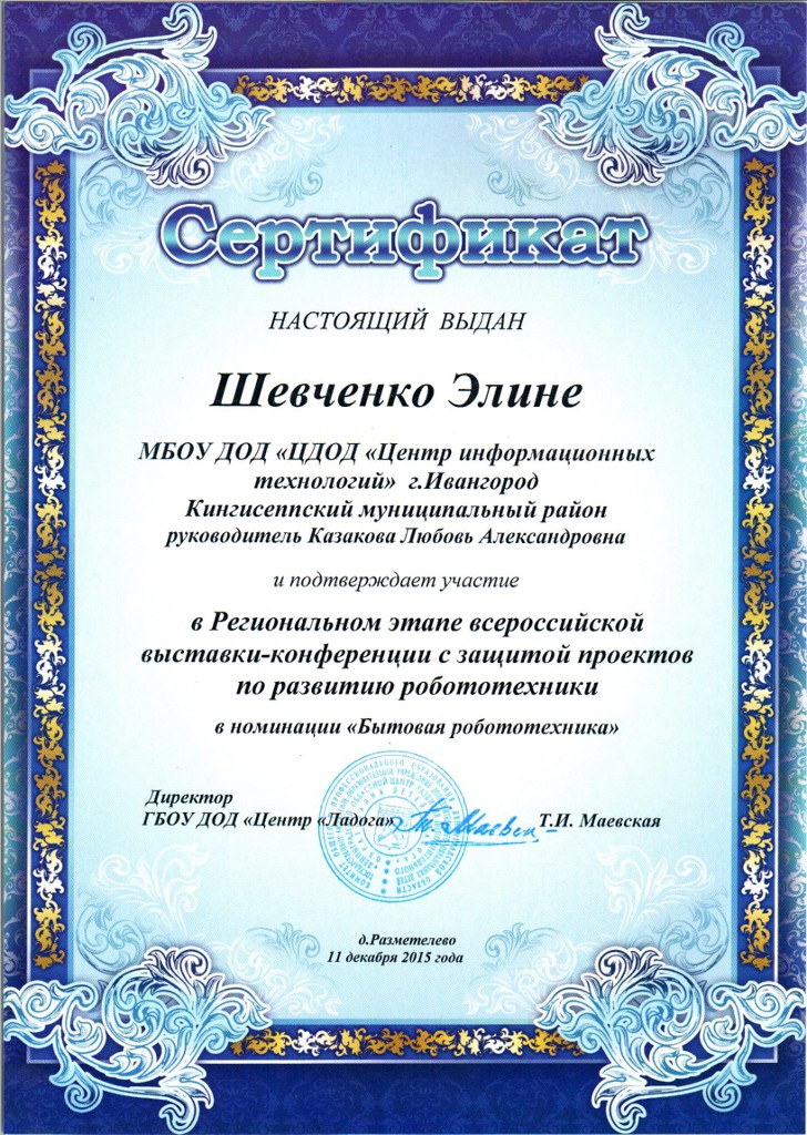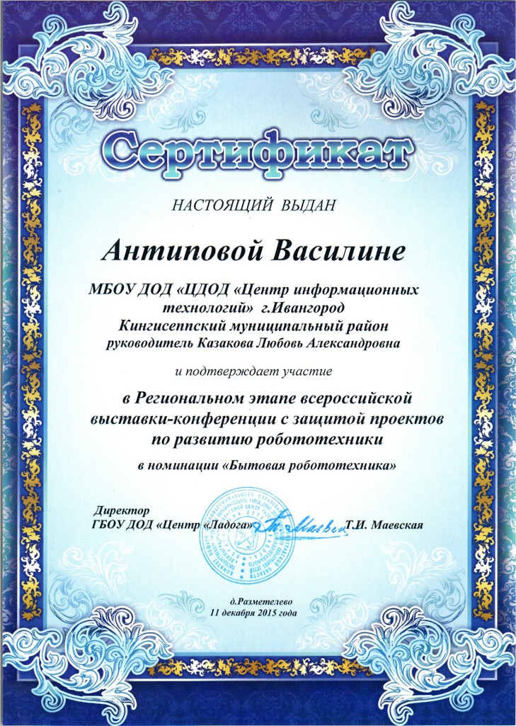 От МБОУ ДОД «ЦДОД «Центр Информационных Технологий» Кингисеппского района было представлено 5 проектов. Итогом защиты стало 2 место проекта «Робот — санитар v.2» (Журавлев Афанасий, Лисин Вадим и Миронов Владислав) в номинации «Промышленная робототехника».