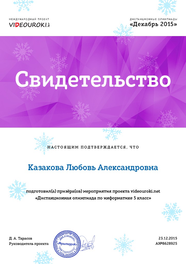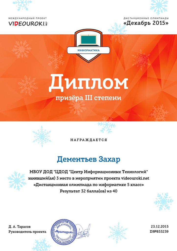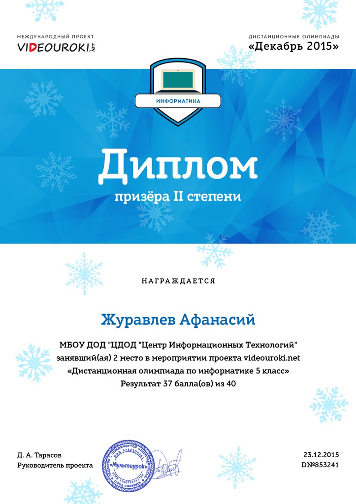 Поздравляем призеров дистанционной олимпиады по информатике среди 5 классов международного проекта videouroki.net!