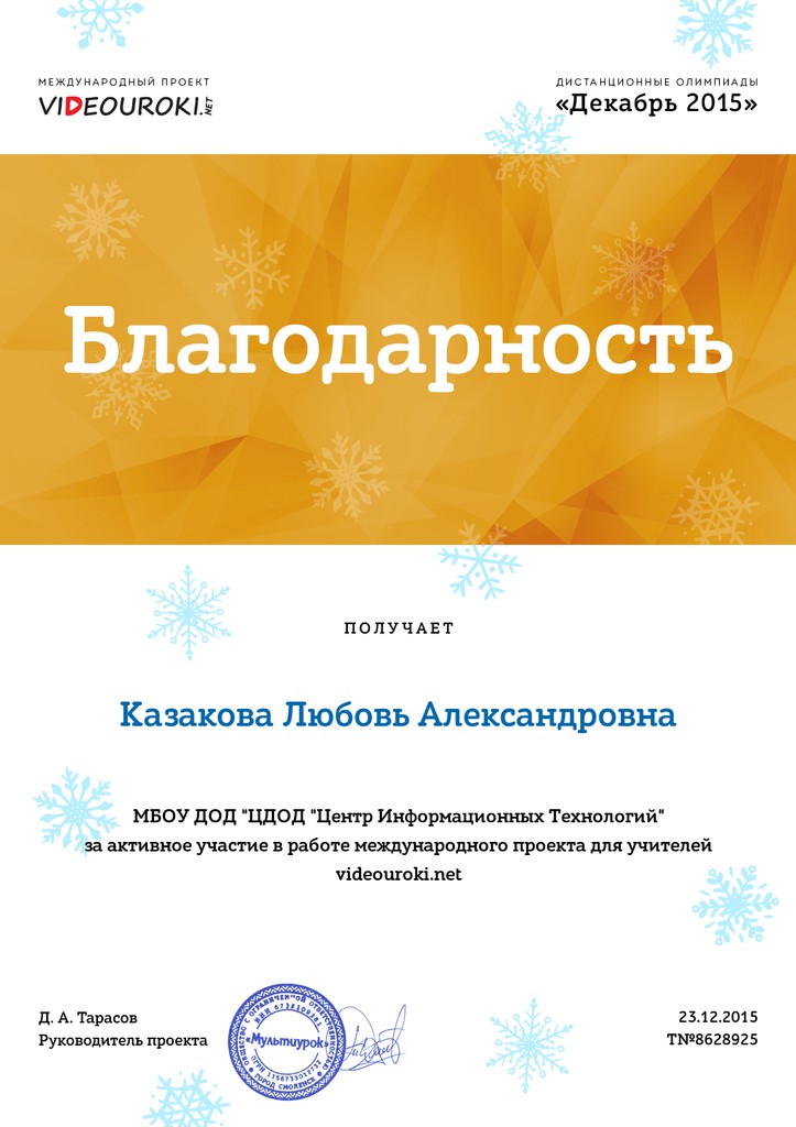 Благодарим педагога дополнительного образования Казакову Любовь Александровну за подготовку детей к олимпиаде.