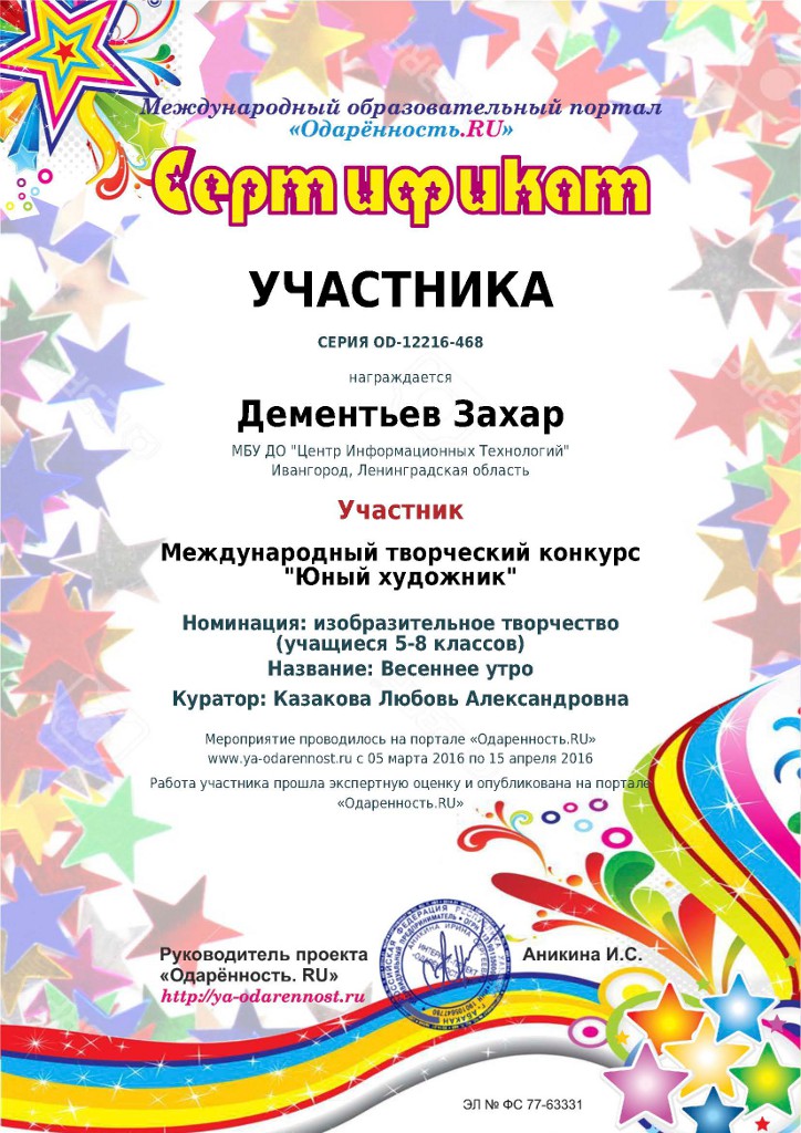 С 5 марта по 15 апреля 2016 на портале «Одаренность.RU» www.ya-odarennost.ru проводился Международный творческий конкурс «Юный художник». Работа Дементьева Захара «Весеннее утро» прошла экспертную оценку и была опубликована на портале «Одаренность.RU».