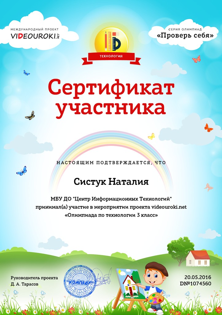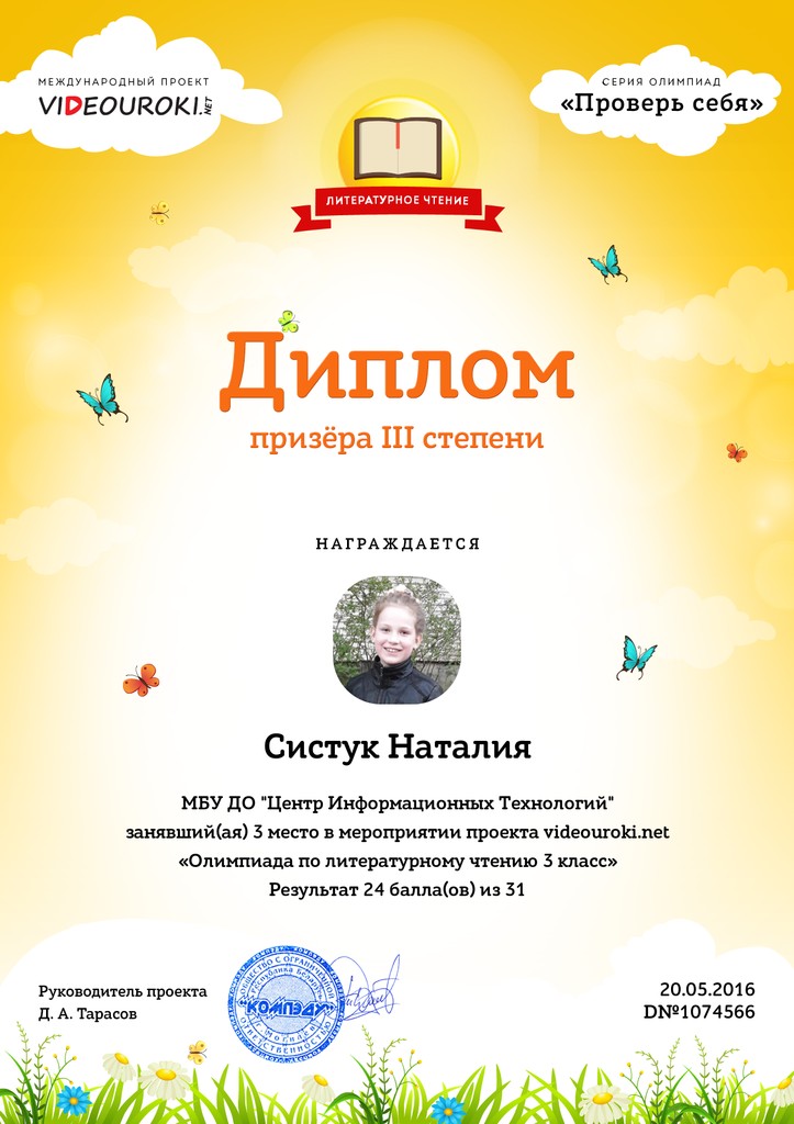 Наташе вручен Сертификат участника Олимпиады по технологии и Дипломы призера III степени Олимпиады по литературному чтению и Олимпиады по ЗОЖ.