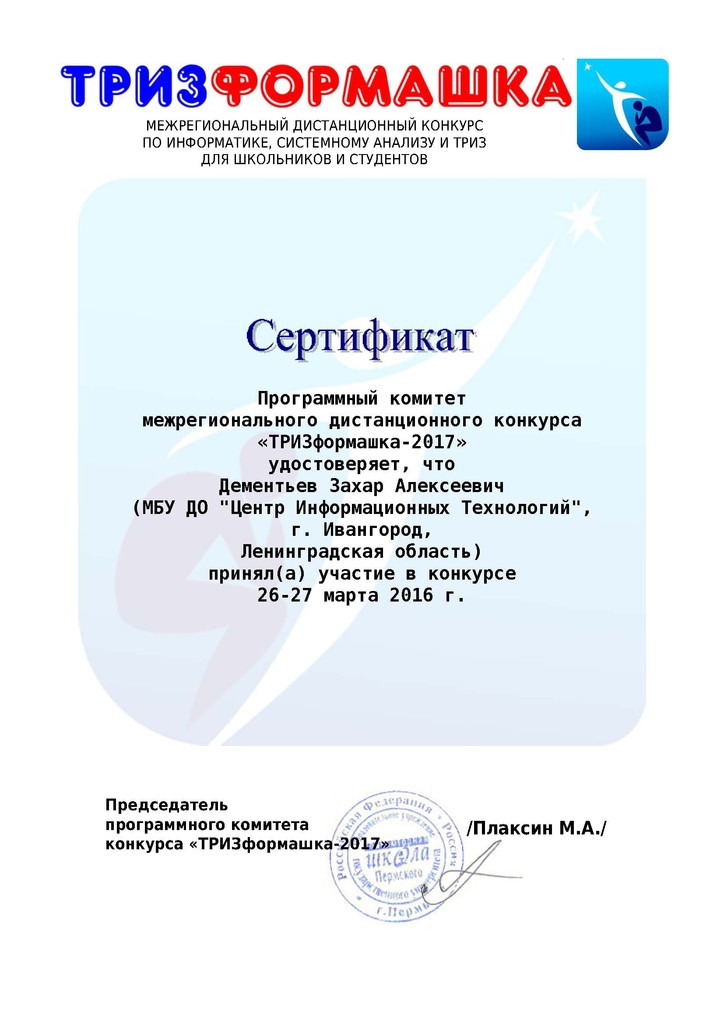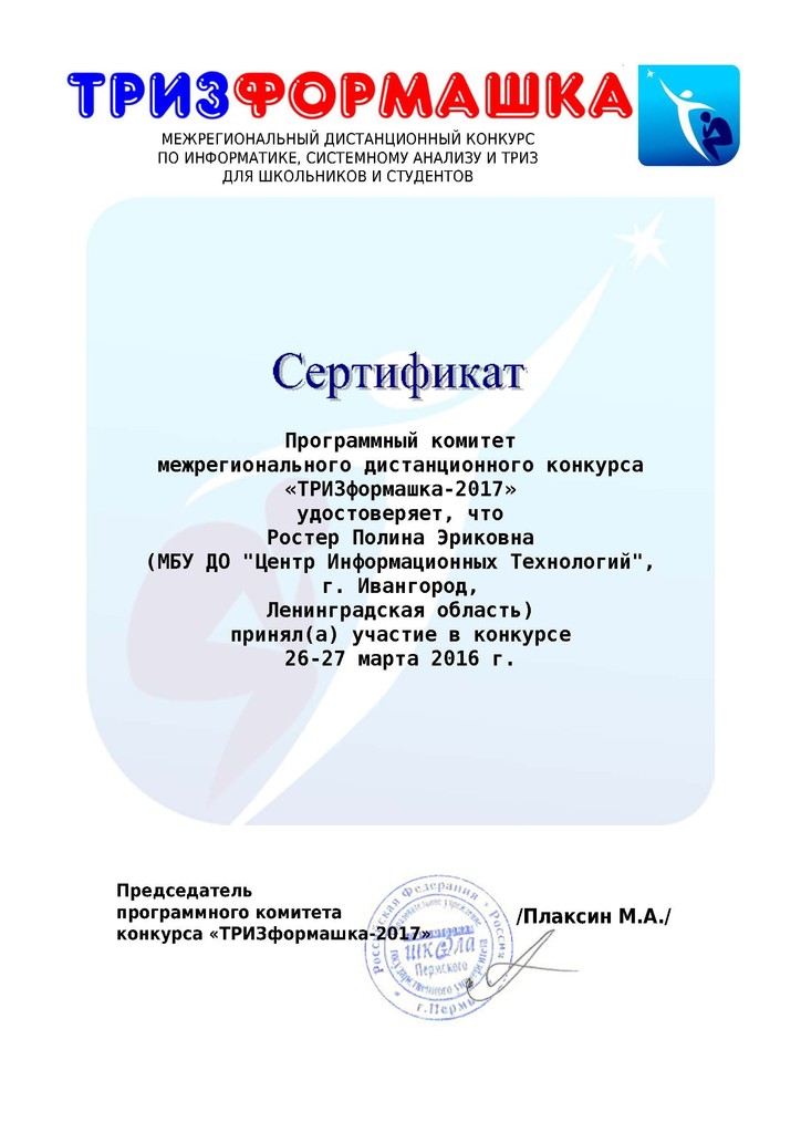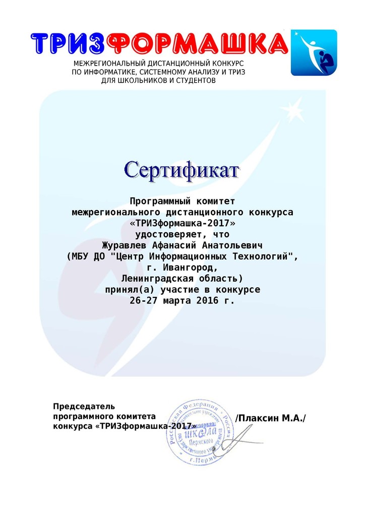 25–26 марта 2017 года состоялся межрегиональный дистанционный конкурс по информатике и Теории решения изобретательских задач «ТРИЗформашка — 2017». Организатором конкурса является факультет довузовской подготовки Пермского филиала НИУ «Высшая школа экономики».