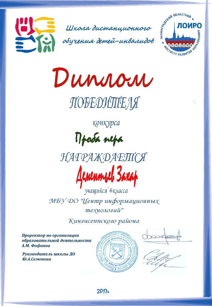 • 1 место — Дементьев Захар 6 класс (МБУ ДО «Центр Информационных Технологий», Кингисеппский район, педагог Казакова Л.А);