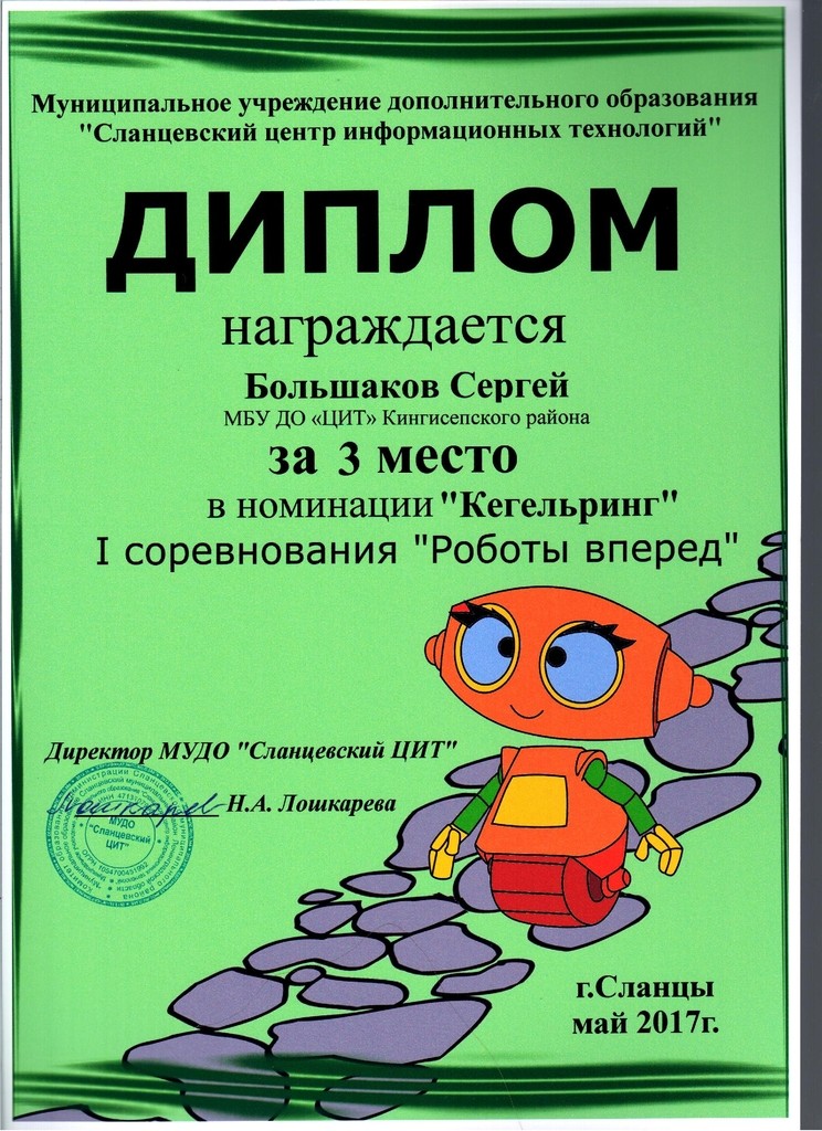 По результатам раундов начислялись баллы. Эмоции ребят зашкаливали, а роботы, к концу соревнований, стали ломаться. После подведения итогов состоялась церемония награждения. В категории «Кегельринг» робот Большакова Сергея занял 3 место. В категории «Тягачи» роботы наших воспитанников не смогли попасть в тройку сильнейших, но ребята получили опыт участия в данной категории и полны желания участвовать в соревнованиях в следующем году.