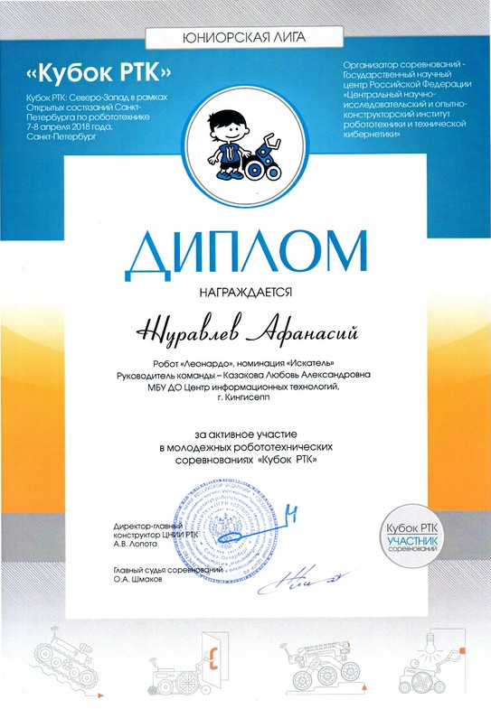 Бережков Андрей, Сабанцев Кирилл и Журавлев Афанасий принимали участие в «Кубке РТК» уже в четвертый раз, но на большом полигоне соревновались только второй. В финал прошли 15 команд. По результатам соревнований, наша команда заняла 7 место и набрала 260 баллов. По сравнению с предыдущими соревнованиями, наша команда улучшила свой результат. В октябре 2017 на фестивале Робофинист ребята заняли 10 место, набрав 150 баллов.