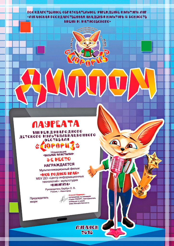 Мультстудия «Кукуруза» из Кингисеппского Центра информационных технологий заняла почетное III место с работой «Мой родной край», которую выполнила Екатерина Волосовцева (педагог дополнительного образования (Барбун Ольга Викторовна).