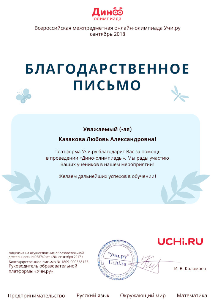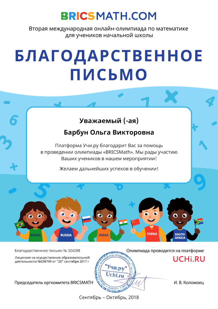 За участие и помощь в организации олимпиад от портала Учи.ру Центру информационных технологий и педагогам Барбун О.В., Систук А.А., Казаковой Л.А., Яковлевой Н.Н. вручены Благодарности.