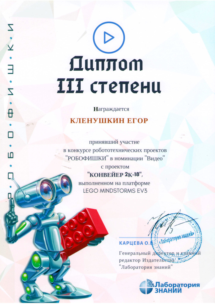 Поздравляем воспитанников клуба робототехники «Леонардо» Бойко Николая, Кленушкина Егора, Филиппова Давида и их руководителя Казакову Любовь Александровну с успешным выступлением на конкурсе робототехнических проектов «РОБОФИШКИ». Проект «Конвейер 2К-18» занял 3 место в номинации «КОНСТРУИРУЕМ РОБОТОВ НА LEGO MINDSTORMS EV3».