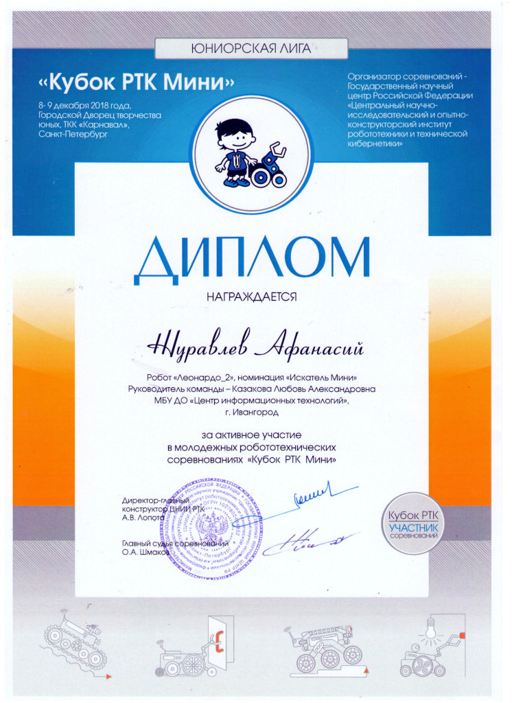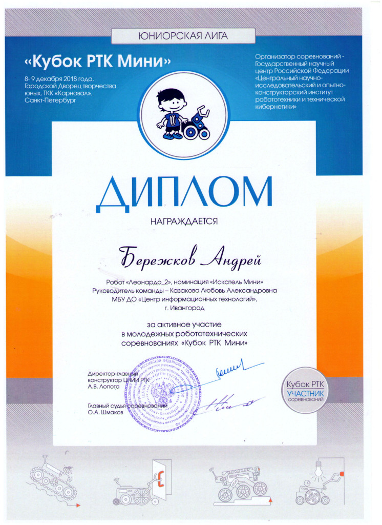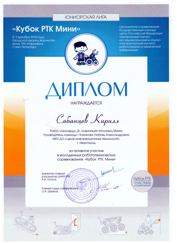 В финальных соревнованиях «Кубка РТК-мини» состязалось 23 команды. Темой состязаний стала «Авария на АЭС» и задача робота — ликвидировать последствия. В этом году наша команда (Бережков Андрей, Сабанцев Кирилл, и Журавлев Афанасий) заняла 12 место, заработав 1185 баллов. За три года, что ребята участвуют в этих соревнованиях, их уровень вырос больше чем в три раз, но и уровень соперников тоже вырос. Это говорит о том, что соревнования развиваются и есть к чему стремиться.