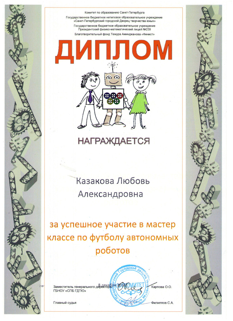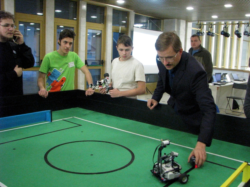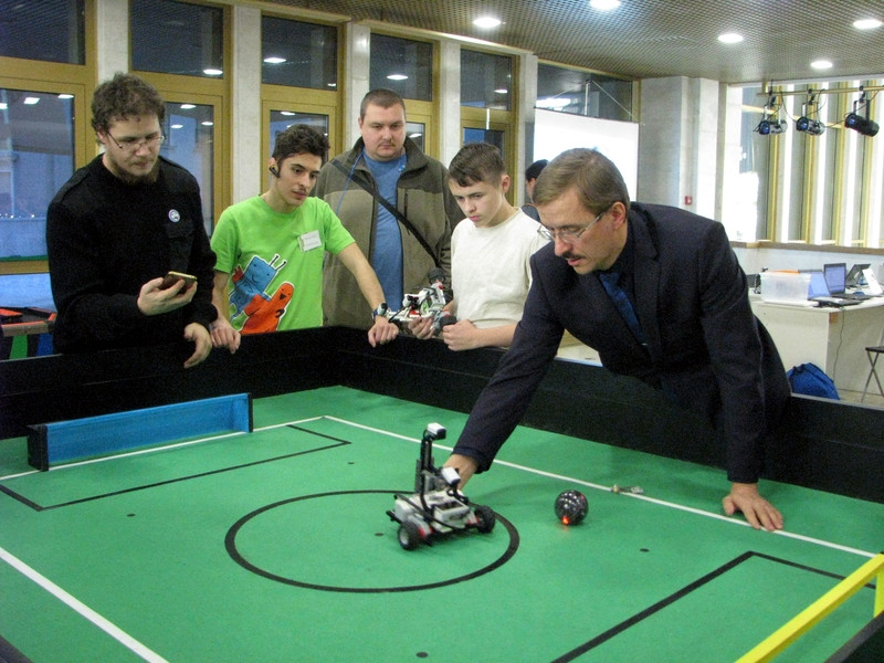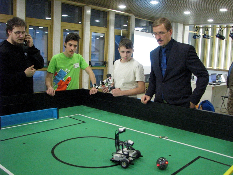 На соревнованиях также был проведен мастер-класс по «Автономному футболу роботов». Участниками этого мастер-класса стали Казакова Любовь Александровна и Журавлев Афанасий. Это новое перспективное направление робототехники, которое сейчас только начинает развиваться наша задача идти в ногу со временем.
