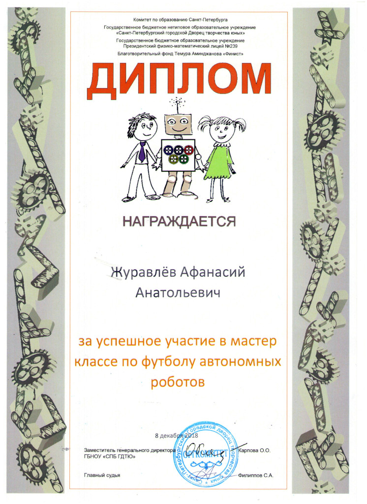 8–9 декабря состоялись Открытые зимние состязания Санкт-Петербурга по робототехнике 2018 года. Воспитанники клуба «Леонардо» принимали участие в двух категориях — «Управляемый футбол роботов» и «Кубок РТК-мини финал». В «Управляемом футболе» наша команда (Бережков Андрей, Сабанцев Кирилл, Атонин Кирилл, Григорьев Данила и Журавлев Афанасий) смогла выйти в финал, заняв третье место в своей группе. Судейская бригада очень долго решала, сколько команд выйдет в финал, но результаты были объявлены в очень поздно, после 23 часов вечера, и двое участников не смогли приехать в Санкт-Петербург. В итоге наша команда играла в неполном составе и не смогла побороться за призовые места.