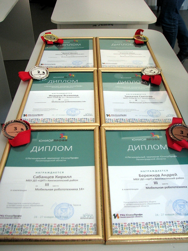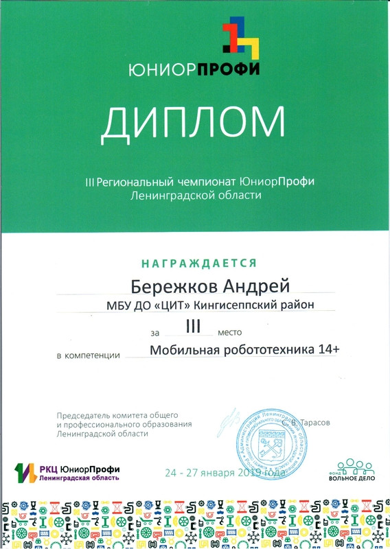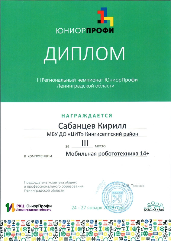 В этом году Кингисеппский район представляли две команды клуба робототехники «Леонардо» (руководитель Казакова Любовь Александровна). Бережков Андрей и Сабанцев Кирилл соревновались в компетенции «Мобильная робототехника 14+», Для Кирилла и Андрея это не первое соревнование, ведь в клубе робототехники «Леонардо» они занимаются уже более трех лет. Перед Региональным чемпионатом Андрей и Кирилл участвовали в учебно-тренировочных сборах и Отборочных соревнованиях по компетенции «Мобильная робототехника». Соревнования были очень напряженными — от того, как точно был запрограммирован робот, зависело прохождения задания. Битва шла за сотые доли балла. Но наш робот справился с заданием и Бережков Андрей и Сабанцев Кирилл стали призерами компетенции «Мобильная робототехника 14+», заняв 3 место.