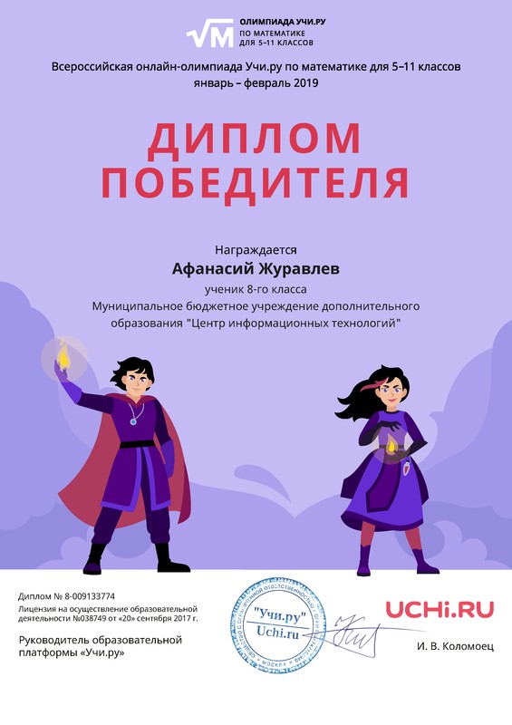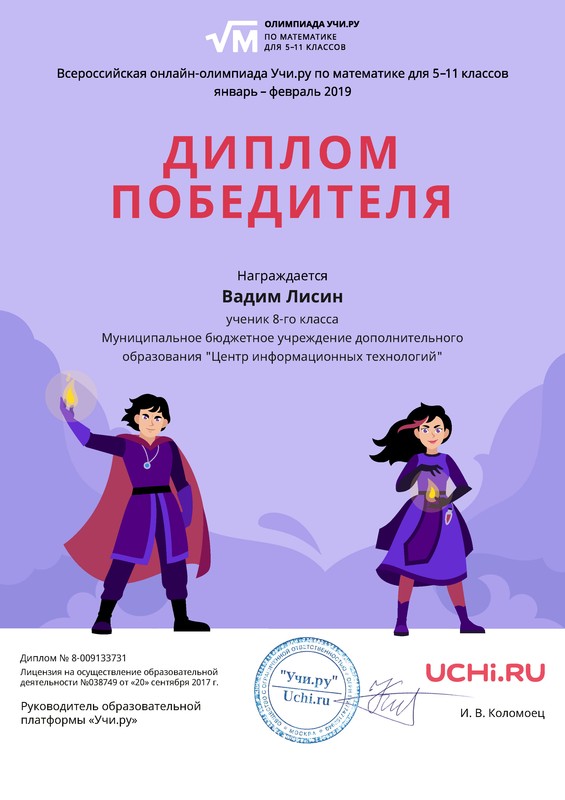 Поздравляем воспитанников ЦИТ Филиппова Давида, Журавлева Афанасия, Лисина Вадима, Ростер Полину, Миронова Владислава и Филиппову Снежану, ставших победителями Всероссийской онлайн- олимпиады Учи.ру по математике для 5–11 классов.