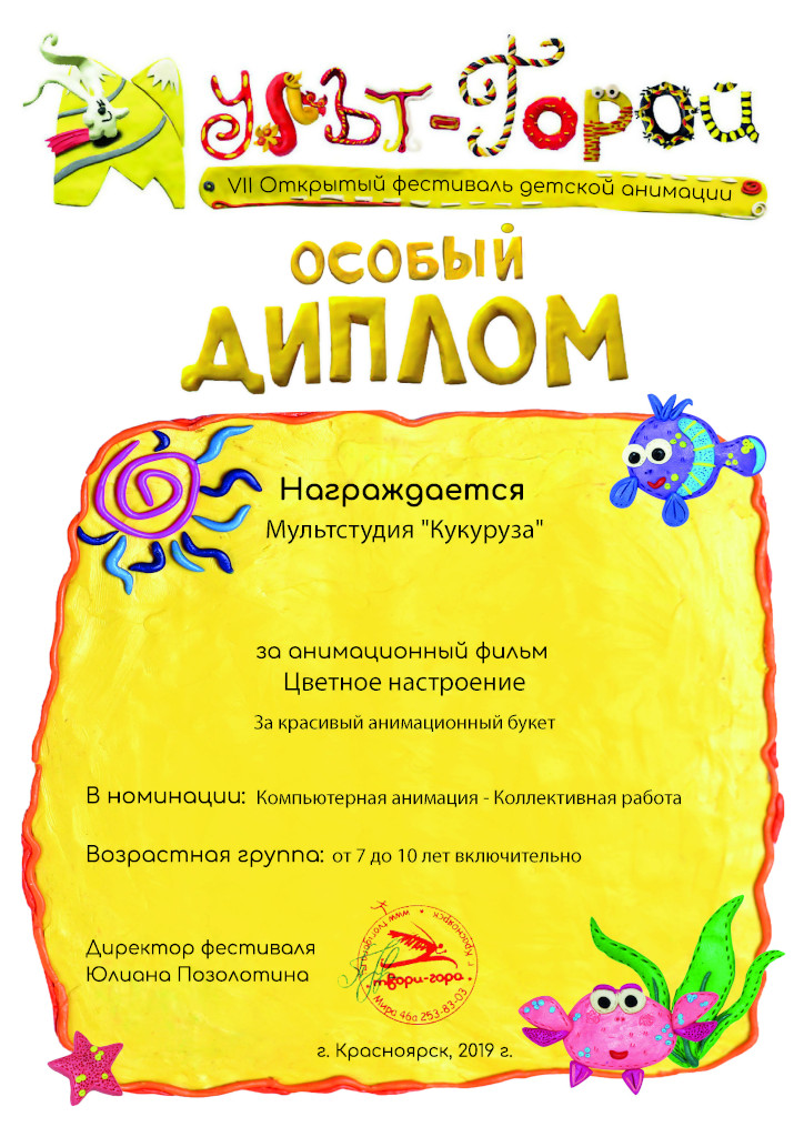 Ребята из Мультстудии «Кукуруза» участвовали в VII Открытом фестивале детской анимации «Мульт-Горой» 2019г. в г. Красноярске. За своё творчество были награждены «Особым дипломом» за анимационный фильм «Цветное настроение».