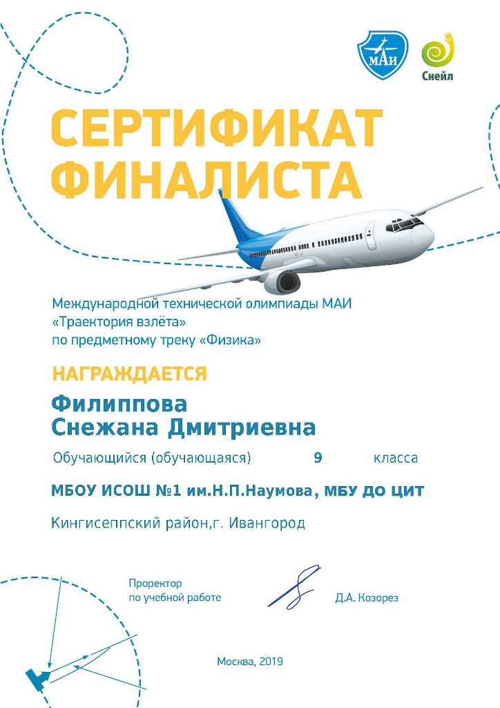 В октябре восемь воспитанников ЦИТа приняли участие в Международной олимпиаде Московского Авиационного Института «Траектория взлета». Филиппова Снежана (9 класс, педагог Казакова Л.А.) стала финалистом.