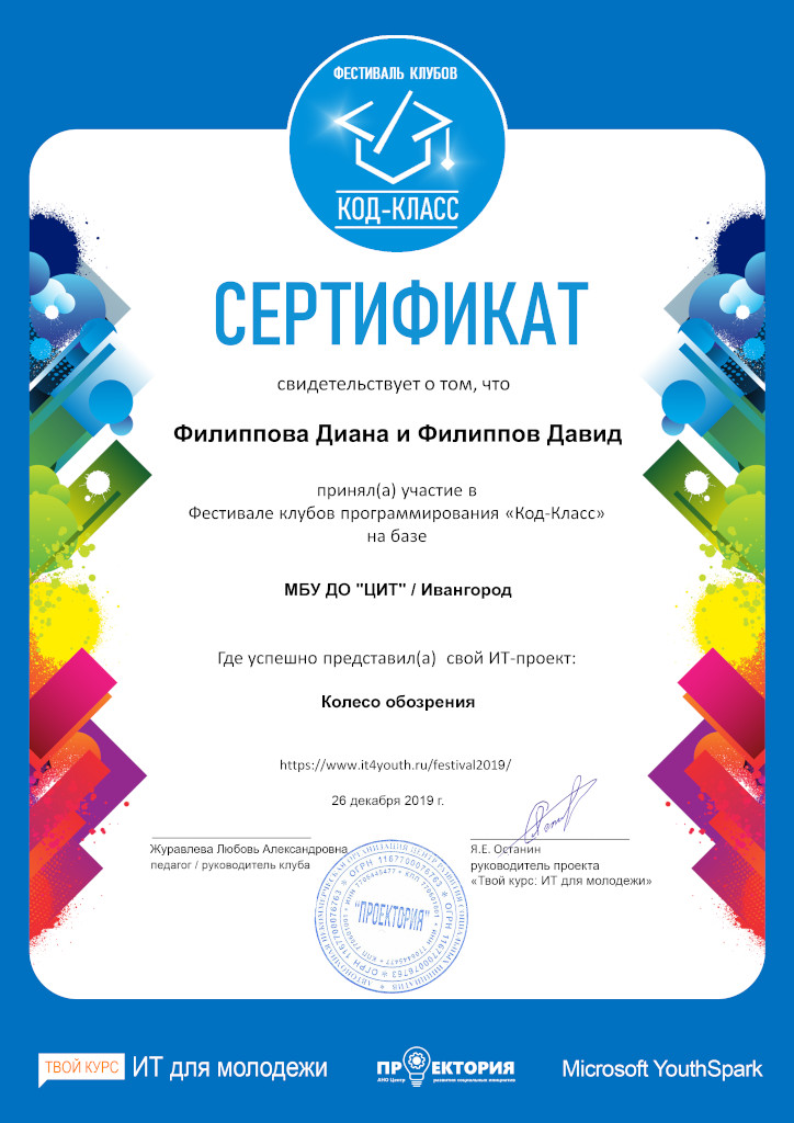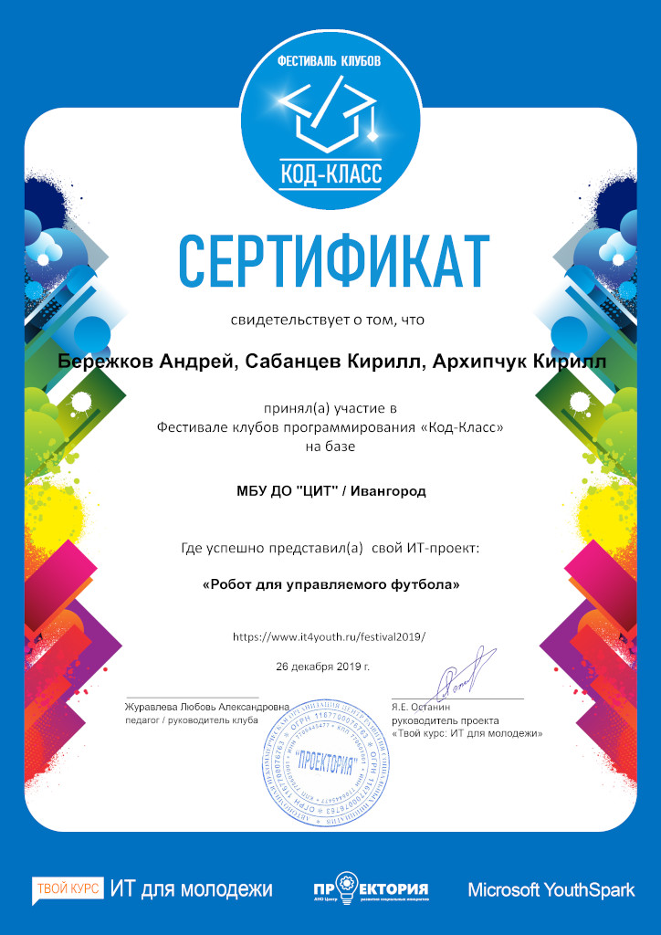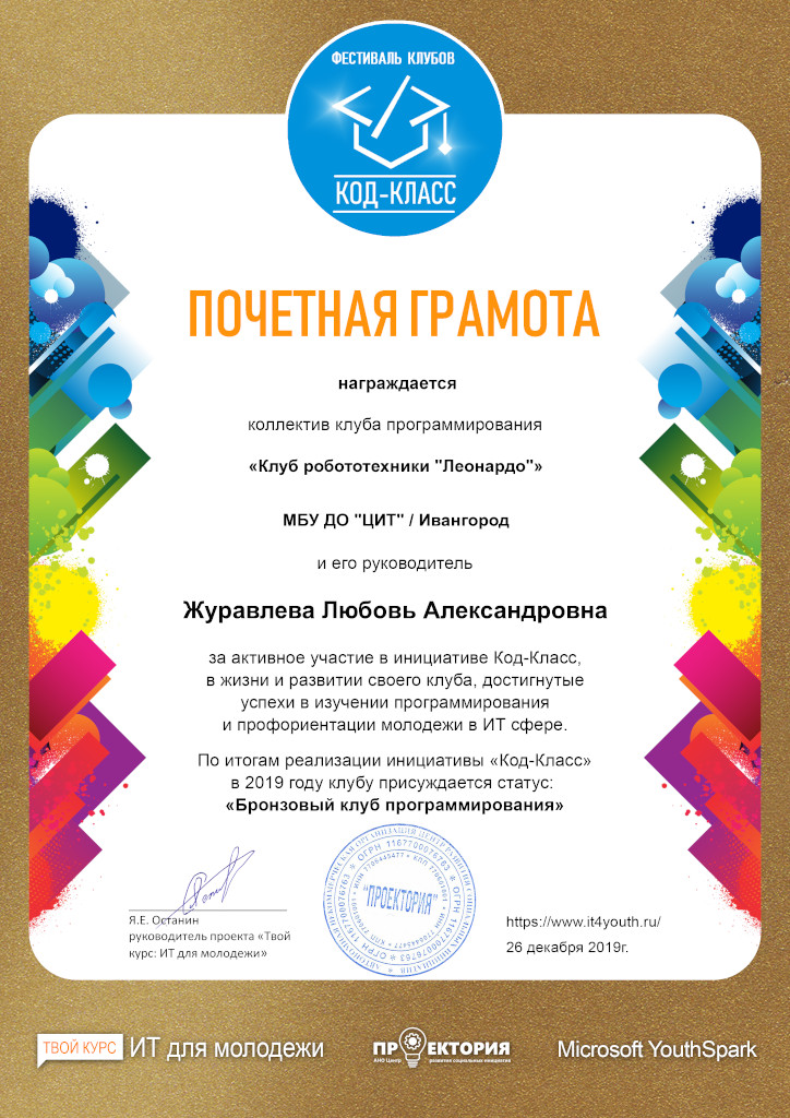 По итогам IV Фестиваля клубу робототехники «Леонардо» был присужден статус «Бронзовый клуб программирования». Сертификатами участников IV Фестиваля отмечены проекты «Колесо обозрения» (Филиппова Снежана и Филиппов Давид) и «Робот для управляемого футбола» (Бережков Андрей, Сабанцев Кирилл, Архипчук Кирилл).