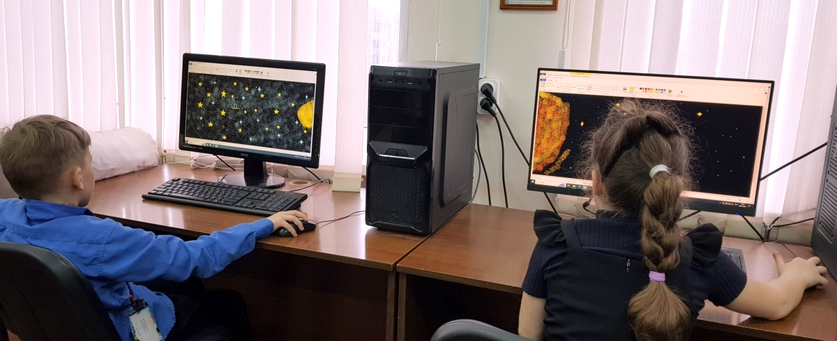 И в заключительной части занятия, ученикам выдалась возможность пофантазировать на тему космоса и создать в графическом редакторе праздничные открытки.