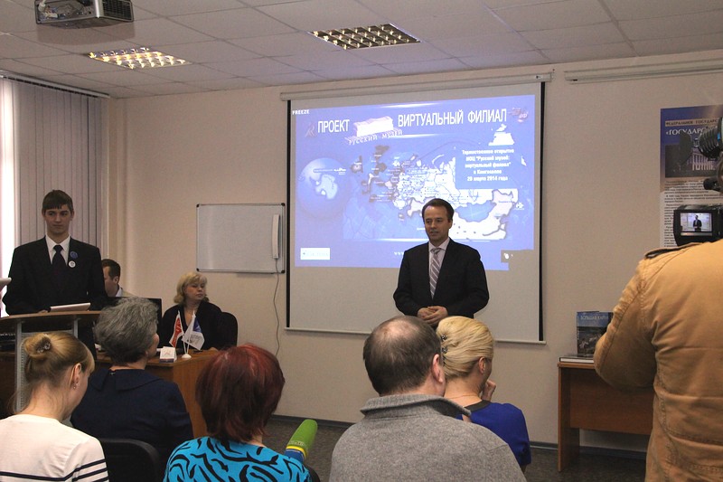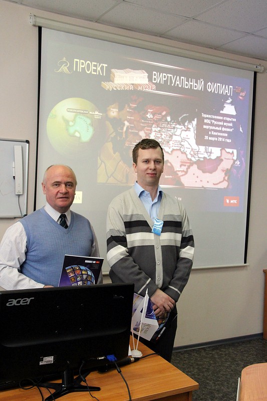 Презентовали проект сотрудники Русского музея ведущий специалист отдела развития проекта «Русский музей: виртуальный филиал», кандидат культурологи, доцент СПбХПА им. Штиглица Татьяна Андреевна Кубанова и заведующий сектором информационно-технического обеспечения отдела развития проекта «Русский музей: виртуальный филиал» Сергей Васильевич Фокин.